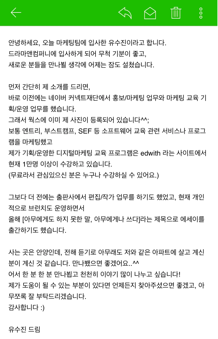 리멤버로 이직하고 첫 출근날 전 직원을 대상으로 자기소개 메일을 써야 했는데, 나란 사람을 소개할 말이 그다지 많지 않았다. 안양에 산다는 것, 이전에 교육 재단에서 마케팅과 교육 프로그램을 만드는 일을 했다는 것을 썼는데도 길이가 너무 짧았다. 이번에도 역시나 내가 쓴 에세이는 큰 힘이 되어 주었다. 이러려고 책 제목을 길게 정한 건 아닌데, 열일곱 글자로 제목을 쓰길 잘했다는 생각이 들었다.