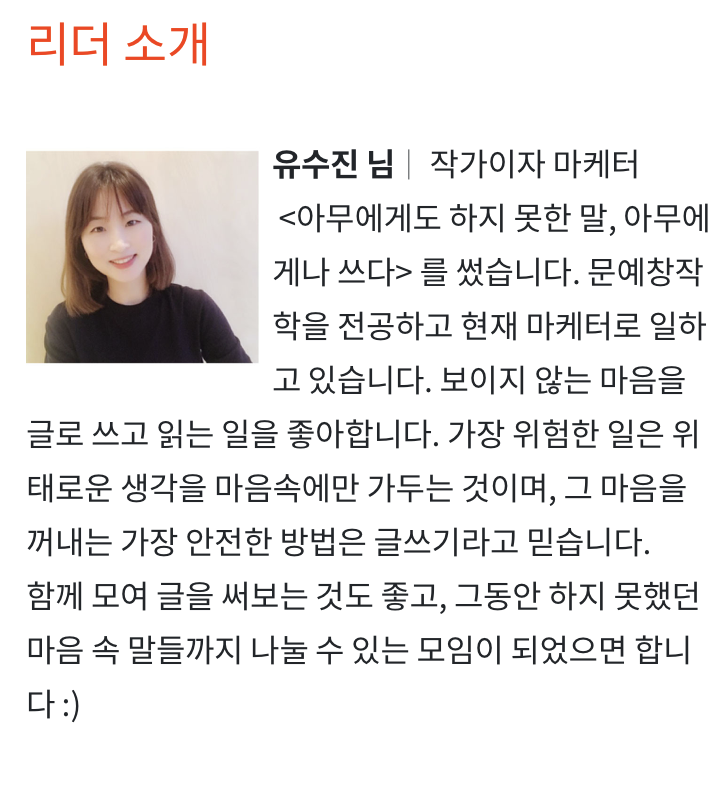확장해보려고 합니다. 누군가와 함께 모여서 글을 쓰고, 그 글에 대해 진심을 다해 이야기를 나누면