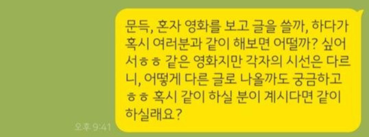 글은 마음만 먹으면 언제든 어디서든 쓸 수 있고, 이야기는 어떻게든 나눌 수 있다는 생각이 들었다. 강제로 집에 갇혀 있는 시간이 많아져 답답하지만, 글을 쓸 수 있는 시간이나 영화를 볼 수 있는 시간이 조금 더 많아진 것은 사실이니까. 이러한 시간을 좀 더 유쾌하게 함께 활용해보자는 나의 제안에 너무나 감사하게도, 멤버 분들은 "저도"라며 뜨거운 동참 의지를 보여주셨다.