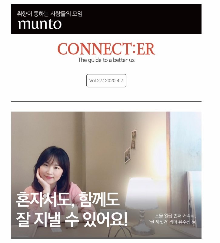 최근 코로나 19로 인해 실내에서 지내는 시간이 많아진 만큼, 혼자서도 잘 지낼 수 있는 나의 취향을 담아보고 싶었다. 내 취향 중 하나가 글쓰기이기도 하니, 부쩍 혼자 있는 시간이 많아져 당황스러운 분들께 글쓰기를 권유해보고 싶었다. 그러나 언제까지고 혼자 지낼 수만은 없는 노릇. 나는 코로나가 안정화되면 공원에 뛰쳐나가 친구와 맥주를 마시기만을 간절히 기다리고 있다. 혼자 써오던 글도, 글쓰기 모임을 통해 함께 쓰는 글로 확장해온 것처럼 올해는 만나는 사람들로부터 내 범위를 더 넓혀나가기 위해 노력하려고 한다. 그래서 뉴스레터의 제목은 '혼자서도, 함께도 잘 지낼 수 있어요!'로 정했다.