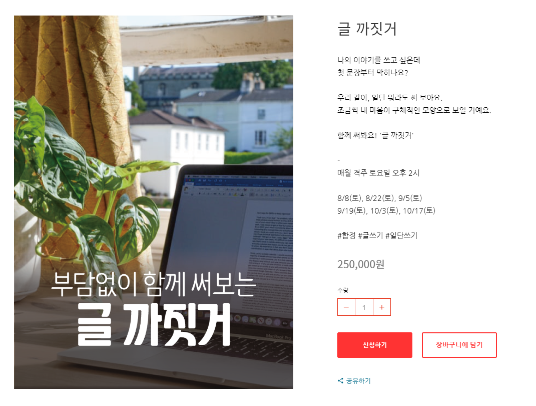 나의 이야기로 글을 써보고는 싶은데 주제를 찾기 어려워 막막하다면, 첫 문장부터 막혀 한 편의 글을 쓰기가 힘드셨다면 저와 함께 <글까짓거>를 함께 해보면 어떨까요? 8월의 뜨거운 여름날, 당신의 못다 쓴 이야기를 나눠주시기를 기다릴게요.