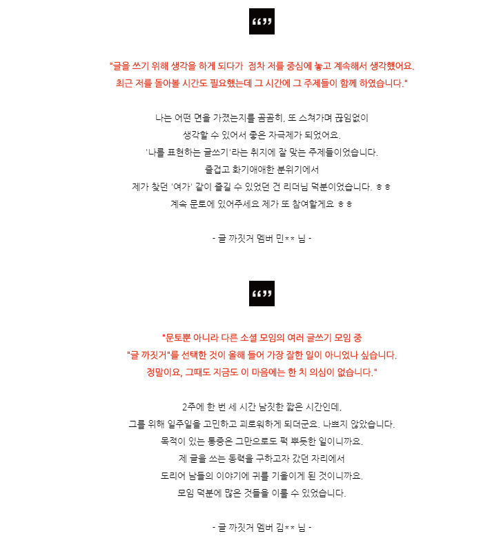 <글까짓거>에서는 혼자 글을 쓰지 않고 함께 글을 씁니다. 쓴 글을 다 함께 나눈 뒤에는 정중한 질문과 대답을 주고받으며 나에 대해 돌아보고, 한 번도 만나본 적 없던 사람들로부터 새로운 나를 발견할 수 있죠. 시즌1을 함께한 민**님께서 글쓰기 모임이 ‘자신을 중심에 놓고 생각하는 좋은 자극제’가 되었다고 말씀하신 것처럼, 여러분에게도 분명 ‘다 안다고 생각했던 나의 또 다른 모습’을 발견하는 계기가 될 거라 믿어요.