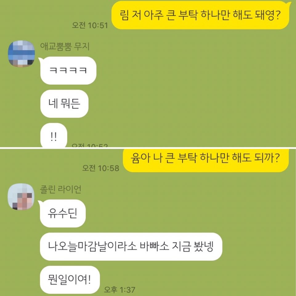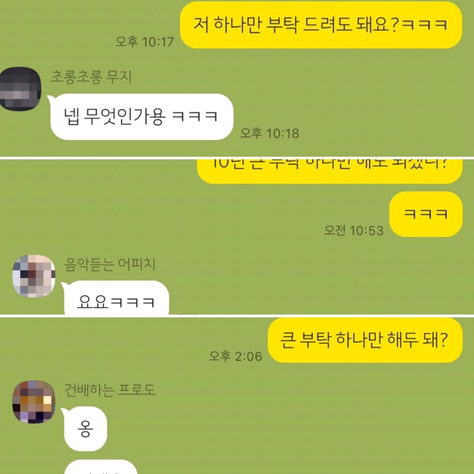 주객전도였다. 내가 마음을 쏟을 대상은 그들이 아니다. 농담처럼 보낸 "부탁 하나만 해도 될까?"라는 말에 계산없이 "뭐든!"이라고 대답해주는 사람들이다. 나의 가시 돋친 세상을 따뜻한 진심으로 감싸주는 사람들을 잊지 말기를. 나 역시 사랑하는 사람들에게 “뭐든!"이라고 말해줄 수 있는 사람이 되기를. 그나저나 그럴 의도는 아니었는데 작은 장난으로 뜻밖의 큰 힘을 얻어버렸다.