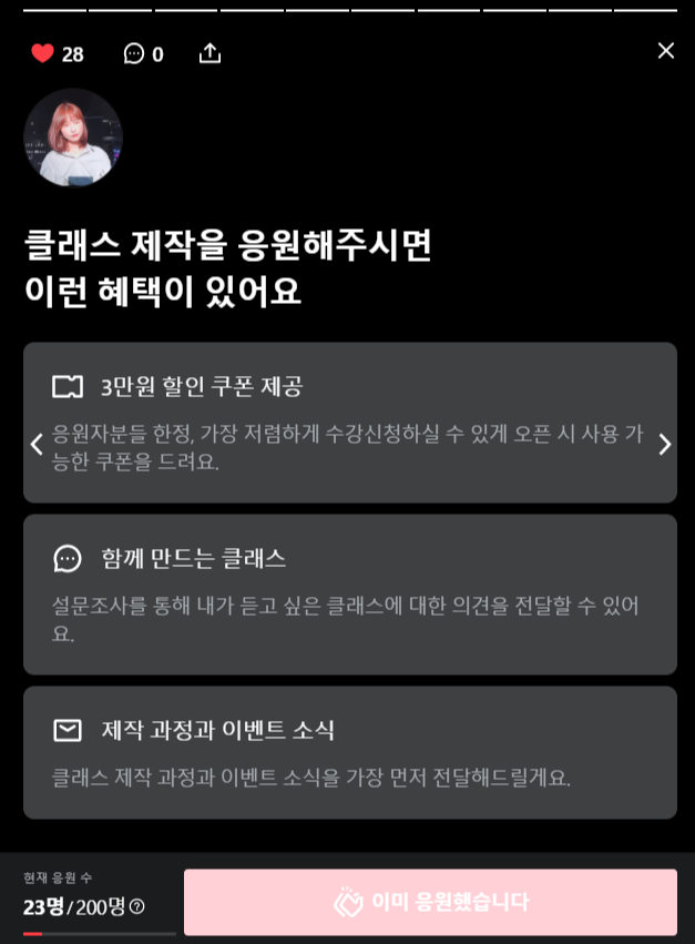 현재는 수요 조사 중이고, 7월 14일까지 응원 수를 기반으로 다음 진행 여부가 결정된다고 하네요. 온라인 글쓰기 클래스에 어느 정도의 수요가 있을지도 궁금합니다. 혹시 관심 있으시면 한번 들러주세요! 아래 링크 혹은 클래스101에서 ‘유수진’을 검색하시면 됩니다:)