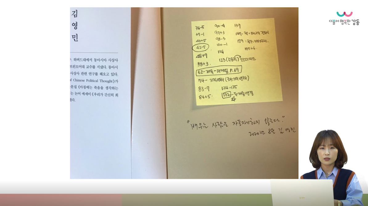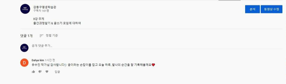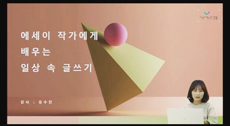 지난 11월, 강동구평생학습관에서 <에세이 작가에게 배우는 일상 속 글쓰기> 교육을 진행하였다. 각 50분-1시간 분량씩 총 8회차 교육 영상을 촬영해 참여 인원 30여 명에 한해 유튜브 송출하는 방식이었다. 글쓰기 모임이 아닌, 지식을 전달하는 강의 형식은 처음이었기 때문에 8월부터 10월까지 무척이나 많은 준비 과정을 거쳤다. 올해 가장 뿌듯하고 감사했던 시간 중 하나.