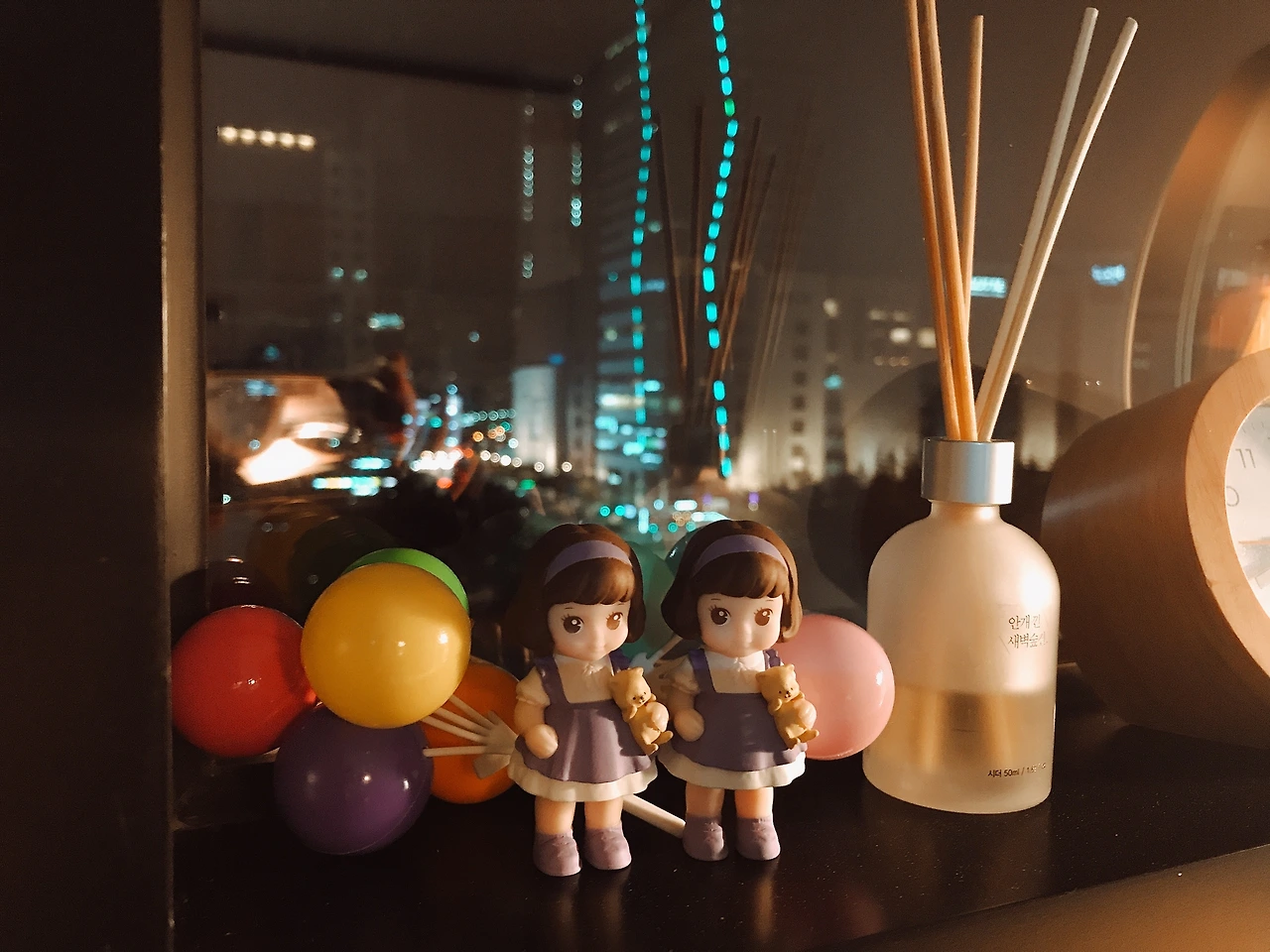 어느 정도 작업실에 적응을 한 후, 친구들을 하나둘씩 작업실로 초대했다. 작업실에 와서 내 말동무를 해주는 것도 고마운데, 친구들은 고맙게도 집들이 선물을 하나씩 들고 와 주었고, 친구들이 방문하면 방문할수록 작업실에 사람 냄새가 더해졌다. 친구들이 집으로 돌아가고 혼자 작업실에 앉아 주위를 둘러보면 내가 채워놓은 물건들이 몇 안 된다. 작업실의 분위기를 따뜻하게 바꿔준 스탠드 조명, 작업실 안의 향기를 가득 채우는 디퓨저, 화장실을 고급스럽게 만들어준 핸드워시, 커피를 마시는 시간을 더 기분 좋게 만들어주는 예쁜 커피잔, 작업실 전체 분위기를 밝게 만들어주는 피규어 등 하나하나 내 사람들의 손길이 묻어있다.