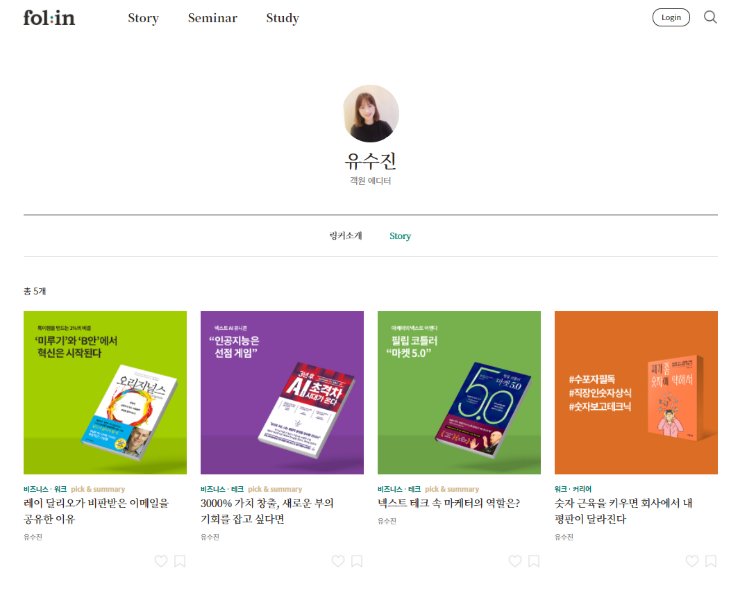 위에서 설명한 것처럼 폴인은 객원 에디터 Pool 등록을 상시로 받고 있다. 언제든 지원을 할 수 있지만, 내부에서 이 사람에게 업무를 맡길지 말지는 프로필을 통해 결정할 것이다. 즉, 내게 업무 의뢰를 맡길 만큼의 프로필이 먼저 준비되어 있어야 한다는 뜻이다. 나의 경우, 이전에 문토나 평생학습관에서 글쓰기 모임과 강의를 진행한 이력이 있고, 웹진에 기고를 하거나 브런치에 차곡차곡 쌓아둔 글이 여러 편 있어 이를 어필했다. 따라서 폴인은 이러한 내 이력에 어울리는 Pick&Summery 라는 비즈니스, 자기 계발, 커리어 도서 중심의 서평을 쓰는 업무를 의뢰한 것이다. 사실 나의 이전의 경력들이 지금의 기고에 영향을 끼치게 될 줄은 몰랐다. 다만, 내가 가진 재능을 작게라도 발산할 수 있는 일을 꾸준히 찾고 실행하다 보니 프로필에 글쓰기 관련 일들이 한 줄 두 줄 늘어났고, 덕분에 기고라는 기회까지 찾아오게 되었다. 다시 한번 강조하자면, 어떤 매체든 기고를 하기 위해서는 자신이 갖고 있는 재능을 어필할 수 있는 프로필을 준비해야 한다. 마케팅 분야에서 오랜 경력이 있다면 회사에서 한 마케팅 프로젝트 경력을 어필할 수도 있고, 스타트업에 대한 관심이 많다면 스타트업에 대한 경력을 중심으로 스토리를 풀어볼 수도 있을 것이다.