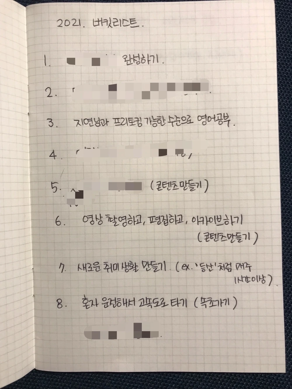 버킷리스트를 쓸 때에는 구체적으로 상상할 수 있도록 구체적으로 쓰는 것이 좋다. 예를 들어 30년 넘게 이루지 못한 목표 중 하나인 '영어로 프리토킹 하기'를 2021년에 이루고 싶었다. 하지만 살면서 영어로 프리토킹을 할 수준의 실력을 가져본 적이 없기 때문에 그 꿈을 이루어낸 모습을 상상하기가 쉽지 않았다. 그래서 내가 아는 사람 중 영어를 가장 잘하는 사람과 영어로 대화하는 모습을 상상해보았다. 훨씬 더 현실감 있는 꿈처럼 느껴졌다. 비록 이 꿈은 올해도 이루어지기 어렵겠지만, 약 세 달간 영어회화 모임에 참여하며 아무 것도 하지 않았을 때보다 많은 것을 얻어냈다고 생각한다.