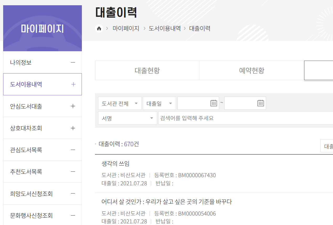 약 10년 동안 도서관에서 책을 빌려 읽어왔다. 문득 그 권수가 궁금해 도서관 홈페이지에서 대출 이력을 찾아보니 670건(권)이라고 했다. 이 숫자를 10년으로 나누고, 12개월로 나누니 한 달에 약 5~6권을 읽었다는 계산이 나왔다. 직접 사서 읽은 책과 누군가 사줘서 읽은 책까지 합하면 더 많을 것이다.