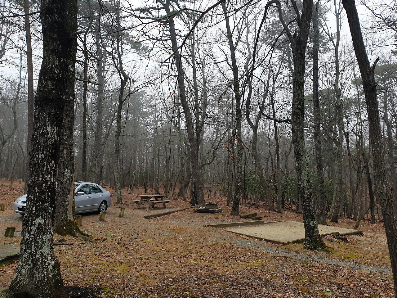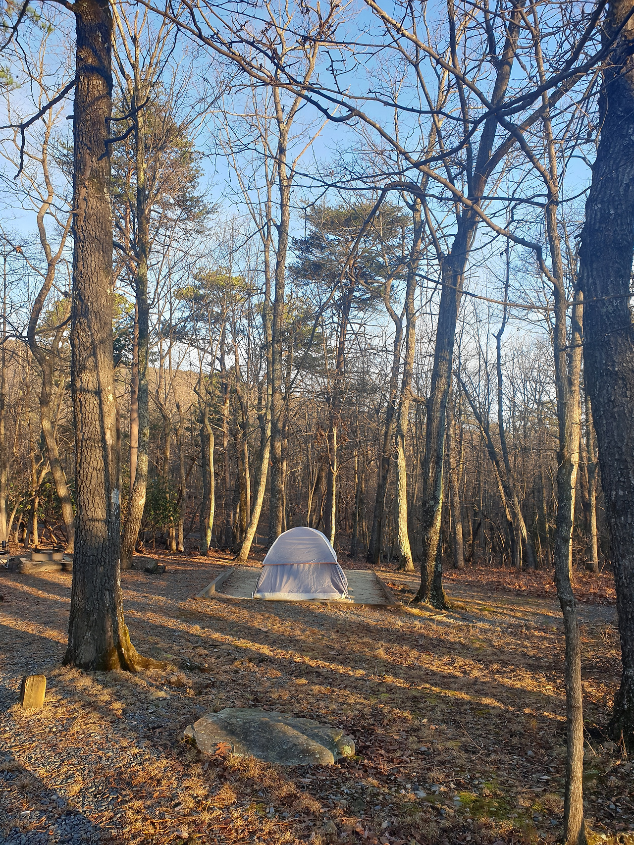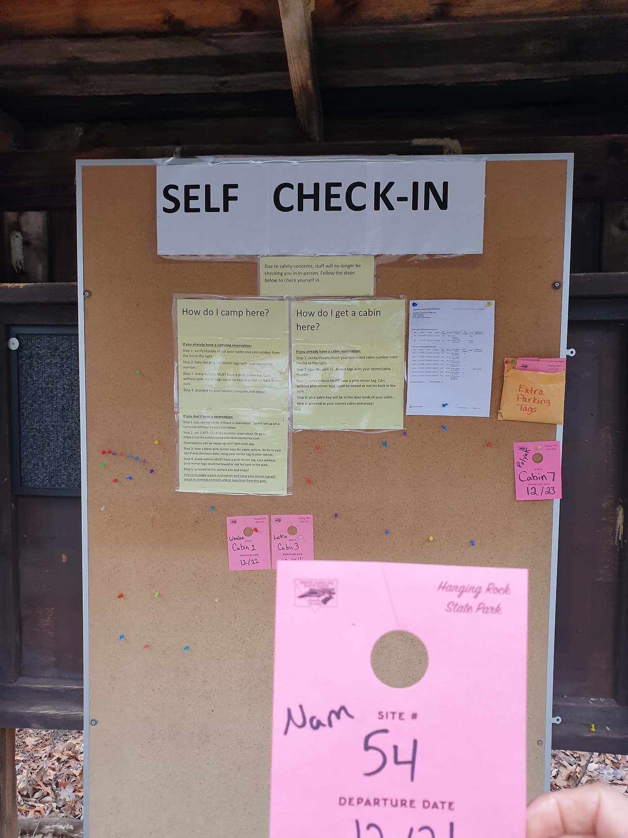 내가 캠핑을 하기로 결정한 곳은 노스캐롤라이나에서도 북쪽에 위치한 Hanging Rock 주립공원이다. 사전 정찰(?)을 위해 구글어스로 검색을 하는데 한글로 '한깅록 공원'이라고 되어 있어서 이 명칭을 그대로 네이버 검색을 해보았더니 아무것도 검색되지 않았다. 곰곰이 스펠링을 살펴보니 '행잉 록' 정도로 읽히는 것을 뒤늦게 알아차렸다. 굳이 해석하자면 매달리는 바위(?)쯤 되려나. 어쨌든 이곳으로 결정하고 인터넷으로 예약을 했다. 미국은 주립공원마다 예약 홈페이지가 잘 구성되어 있어 어렵지 않게 예약할 수 있었다. 심지어 밀리터리 할인(10%)까지 받아서 16$라는 엄청나게 저렴한 가격에 예약할 수 있었다. 도착하니 코로나 때문에 셀프 체크인을 하고 있었고, 게시판에 내 이름이 적힌 주차증을 갖고 예약한 캠프 사이트로 이동했다.