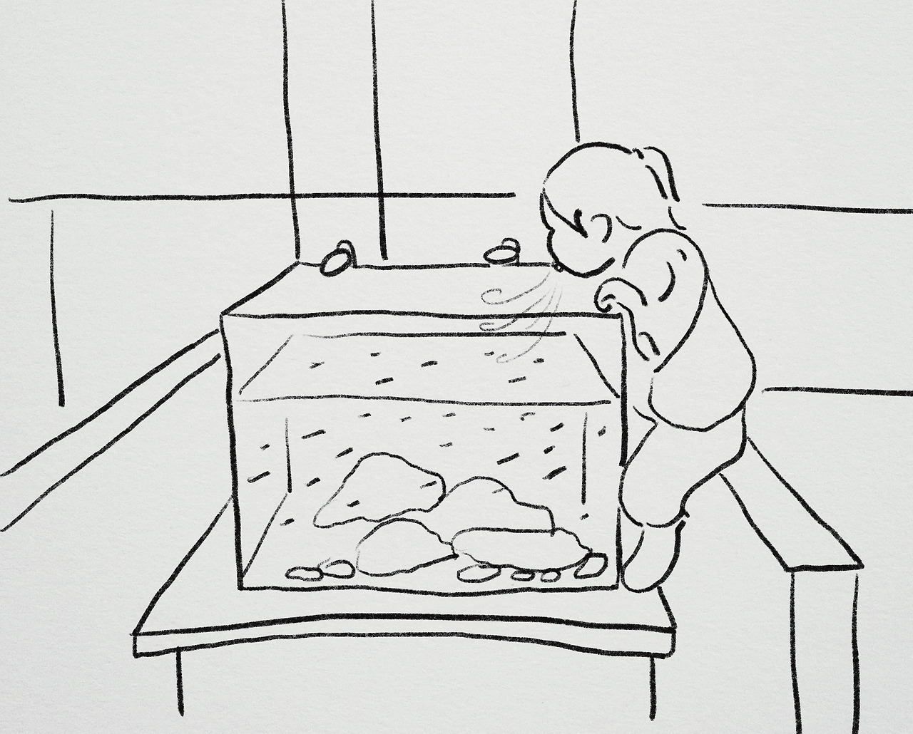 한 명은 어항에 매달려 물고기 구경을 하러 가고