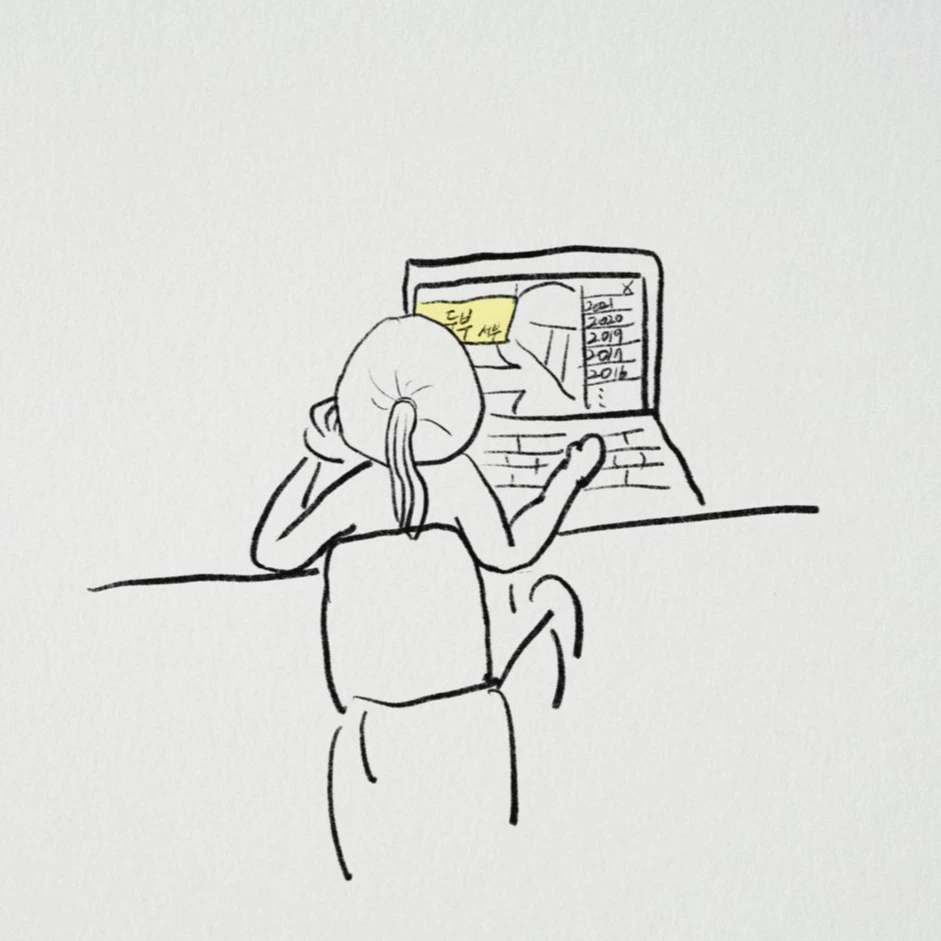 집 근처에 있는 시장 입구에 오래된 두부가게가 있다. 특이한 점은 입구와 옆쪽 유리창에 손글씨로 단어나 짧은 문장을 쓴 종이가 붙어 있다는 것. 전통시장이 먹자골목으로 변하는 동안을 어떻게 기억하고 계실까. 인터뷰를 해주실까. 생각을 하며 골목 로드뷰를 켠다. 2011년부터 2021 6월 최신까지 1~2년에 한 번씩 기록되어있는 골목. 두부 가게의 노란 간판이 원래는 연두색이었다는 사실을 알아낸다.