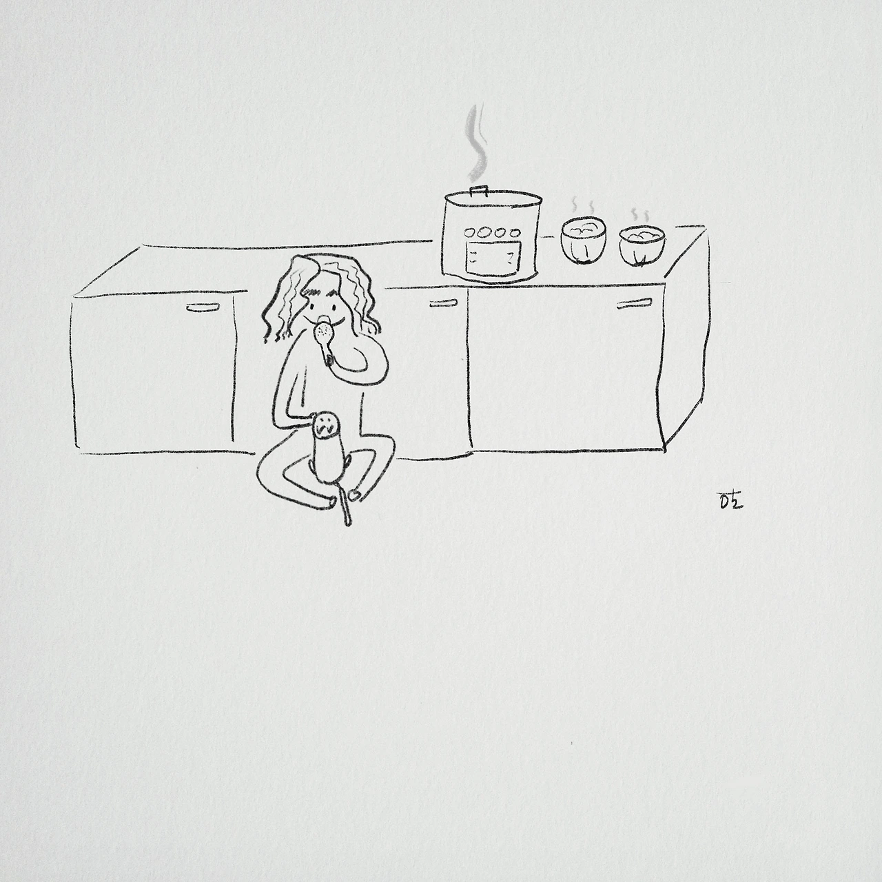다 된 밥을 그릇에 담고 주걱에 붙은 밥을 먹는데 감자가 혼자 뭐 맛있게 먹냐며 가까이 온다. ‘너도 먹어 볼래?’하며 밥풀 하나 떼어 주니 그걸 또 냠냠 잘 먹는다.