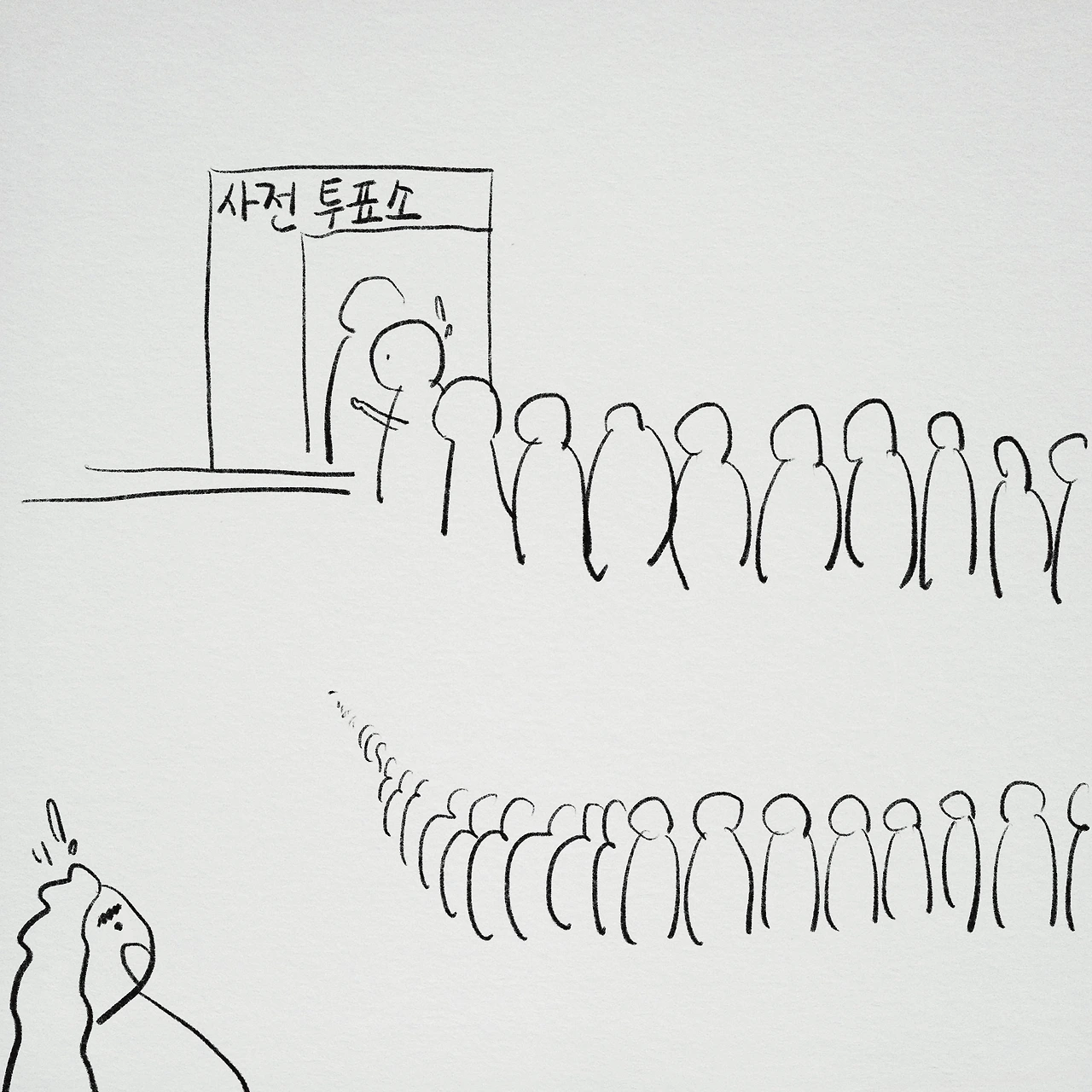 사람들이 길게 줄지어 서 있길래 놀라서 보니 사전투표 줄이었다. ‘투표율이 높다고 하더니 정말이네’ 생각하던 차에 우리를 초대한 친구와 눈이 마주쳤다. 친구는 금방 하고 가겠다며 열쇠를 건네주었다.