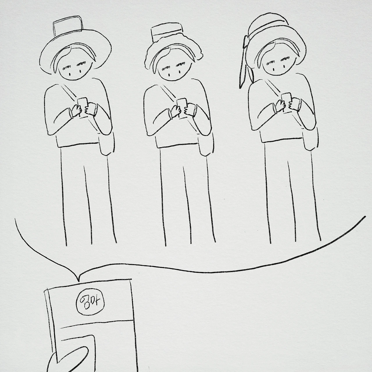 비는 안 오는지 잘 놀고 있는지 생각하기 무섭게 휴대폰이 울리더니 다짜고짜 사진 세 장이 왔다. 모자가게인 듯했다. 종류 다른 세 가지 모자를 쓴 엄마 뒤로 이모들의 옆모습도 보였다.