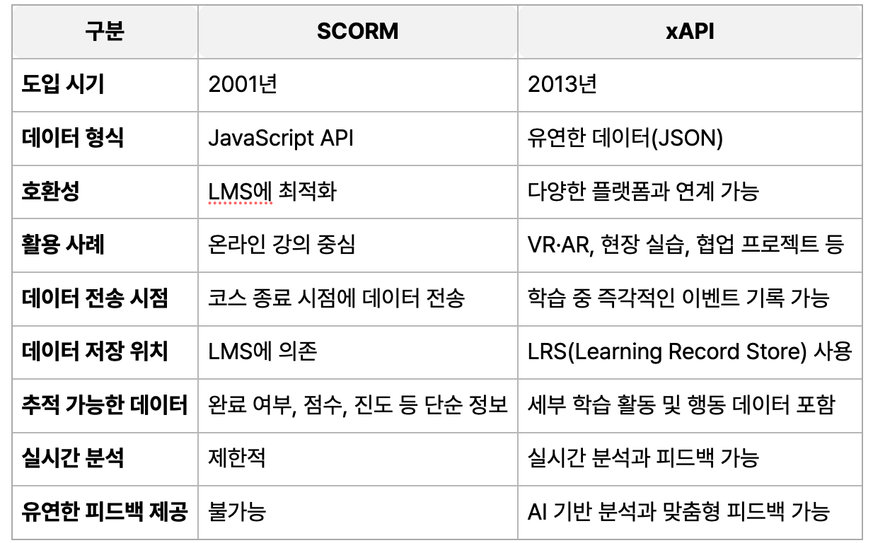 SCORM은 2000년대 초부터 LMS와 온라인 학습 콘텐츠 간의 호환성과 상호운용성을 보장하는 표준으로 자리 잡았습니다. 온라인 코스의 완료 여부, 점수, 성적 기록과 같은 단순한 학습 성과 데이터를 수집할 수 있도록 설계된 SCORM은 주로 정형화된 강의 모듈에 적합했습니다. 그러나 현대 교육에서 요구되는 비형식적이고 복잡한 학습 경험을 반영하는 데는 한계를 드러냈습니다.