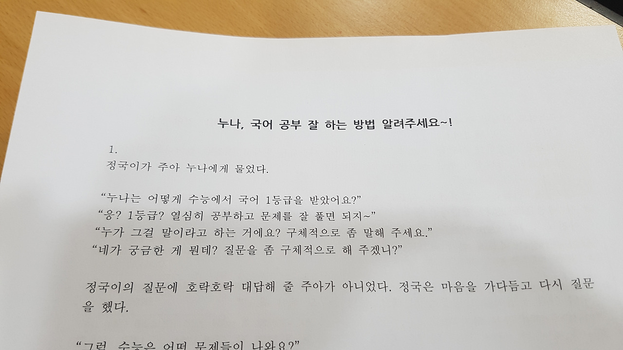 “수능? 수능은 모든 문제가 다 나오지. 이를테면, 설명하는 글, 설득하는 글, 주장하는 글들도 나오고, 시, 소설, 수필, 시나리오 같은 문학 작품도 나와. 맞춤법 같은 문법 문제도 나오고.”