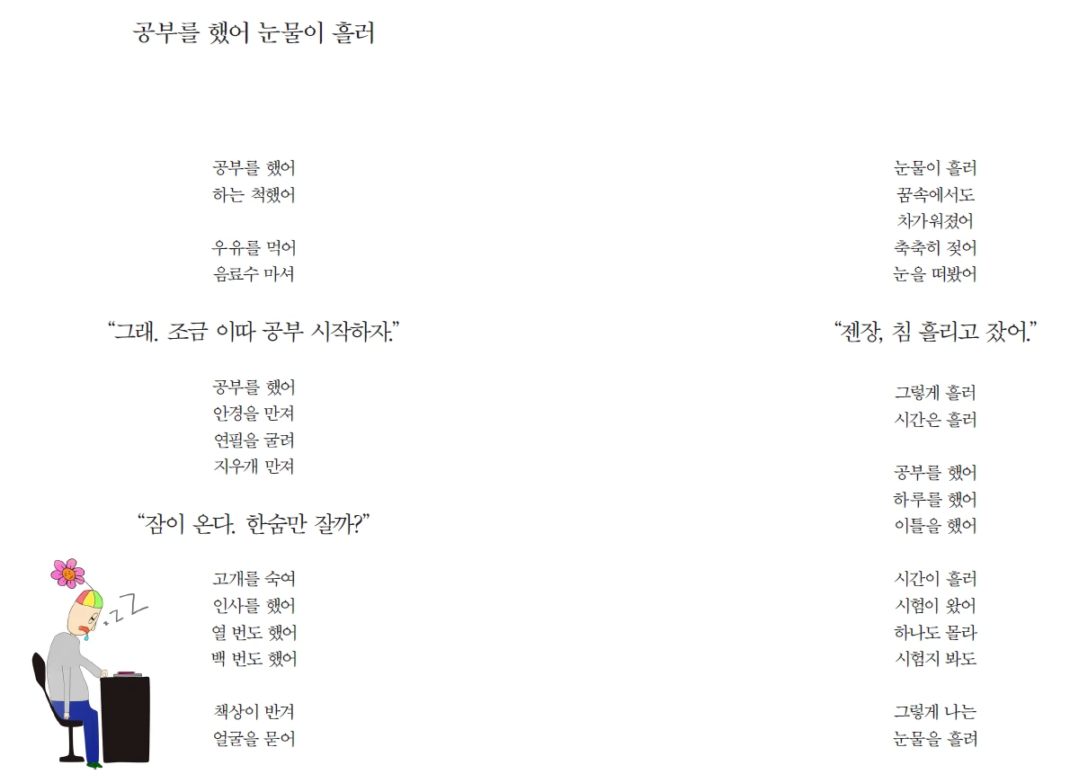 꾸벅꾸벅 책상을 향해 인사를 한다. 열 번도, 백번도 더 한다. 어느새 책을 비개 삼아 얼굴을 파묻는다. 꿈속에서는 드라마가 펼쳐진다. 눈물을 흘리는 자신을 발견하며 잠에서 깨는데, 책은 축축이 젖어 있다. 침을 흘리며 잔 것이다.