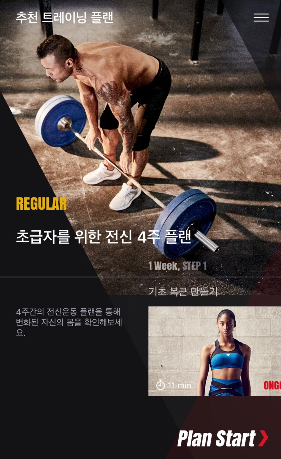 불과 최근까지만 해도, 스포츠 의류 회사에서 제작한 어플이라고하면 판매하는 제품의 소개와 가격들이 첫 페이지에 나올 것이라고 생각할 수 있지만, 이 어플은 많이 다릅니다. 고객이 직접 본인의 신체 트레이닝 레벨 수준을 진단할 수 있는 프로그램을 시작으로 레벨별 운동 프로그램과 추천 트레이닝 플랜을 통해 운동 영상을 부여받는데요, 이 모든 것들이 모두 무료입니다.