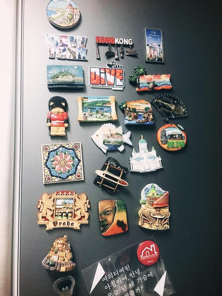 나는 머물렀던 도시에서 항상 엽서와 자석을 구매한다. 자석을 구매했다는 건 '여기 정말 마음에 들구나? 짜식. 나의 도시로 인정 해줄게' 정도의 의미가 있다. 사실 자석은 일가 친척들에게 많이 뺏겼다. 유럽에서 공부하고 돌아온 나는 여행을 하느라 돈을 다 써 버렸고, 친척들의 선물을 구매하지 못했는데 (사실 용돈을 약간 주셨기 때문에 작은 것이라도 사왔어야 했던 것), 한 명씩 친척들이 놀러올 때 마다 어머니는 황급히 냉장고 앞에 달려가 자석을 몇 개씩 떼어 주었다. 추억이 없는 자석이 이억만리 건너온 들 무슨 의미가 있을까? 황망하게 나랑 헤어진 내 초기 자석들에게는 애설픈 이별이었지만, 진짜로 독립을 한 후에는 나의 생활 공간에 잘 보이는 곳에 항상 이 자석들을 훈장처럼 전시해 두고 누구에게도 뺏기지 않았다. 설거지를 하다가, 맥주를 꺼내다가, 문득 쳐다보게 된다. "크, 뉴욕에서 좋았지. 인생에 그런 야경이 또 있을까." "아, 남프랑스 정말 최고였지, 인생에 다시 한 번 가 봐야지." 소복히 쌓여 있는 모습만 봐도 귀엽다. 내가 이룬 것이 지금까지 없을지라도 이렇게 많은 곳을 둘러보았다면 실패한 인생을 아닐 것 같다는 생각도 잠시 해 본다.