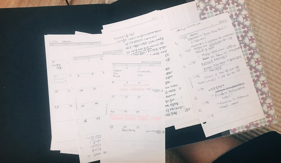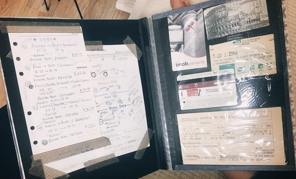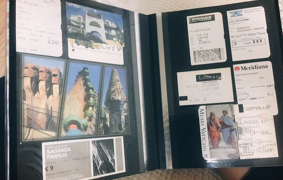 스마트폰이 없던 시절, 예약한 게스트하우스의 주소와 약도를 빼곡히 적어놓은 쪽지나 비용 계획을 적어놓은 수첩을 보면 절로 어린 시절의 내가 대견해 진다. 각 도시에서 가져온 엽서나 입장권, 버스 티켓 같은 것들도 깨끗하게 보관되어 있다. 여행을 하면서도 하나씩 봉투에 넣어 잘 챙겨오다가 제작년에서야 이 스크랩북에 정리를 했다.