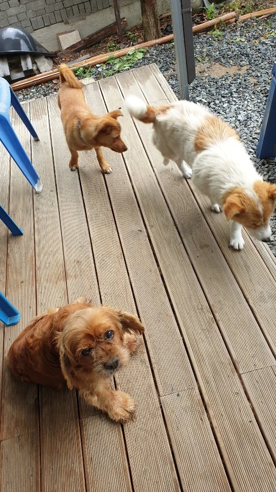 허접한 철장 속에서 아웅다웅 살다가, 폭신한 카펫이 있는 집에 입성하게 된 강아지는 순둥이 그 자체 더란다. 똥오줌도 알아서 가리고, 엄마와 아빠 꽁무니를 졸졸졸 따라다니면서 마음을 살살 녹여 버렸다. 팔다리가 앙상하게 말라있던 강아지에게 사료랑 먹을 것들을 챙겨주니, 걸신이라도 들린냥 허겁지겁 먹어댔는데, 그 모습이 짠하기 그지 없었다. "아이고, 할머니가 먹을 것도 안 줬나 보네."