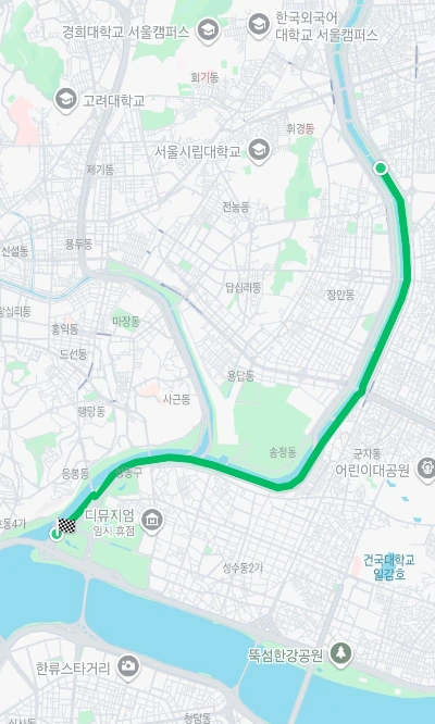 먼저 1.05km을 걷고 1.2km를 뛰고 0.11km을 걷으면서 워밍업을 했습니다. 그리고 중랑천 둔지에서 한강공원까지 7.63km 뛰어서 도착했습니다. 여기서 멈추지 않고 그 한강공원에서 1.16km을 걷고 0.14km 뛰었습니다.