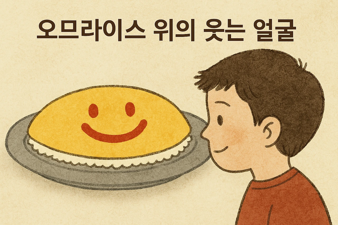 지금도 그 오므라이스를 떠올릴 수 있습니다. 케첩으로 그린 웃는 얼굴, 따뜻한 밥, 조용히 건넨 숟가락, 그리고 아무 말도 하지 못했던 어린 저 자신까지도.