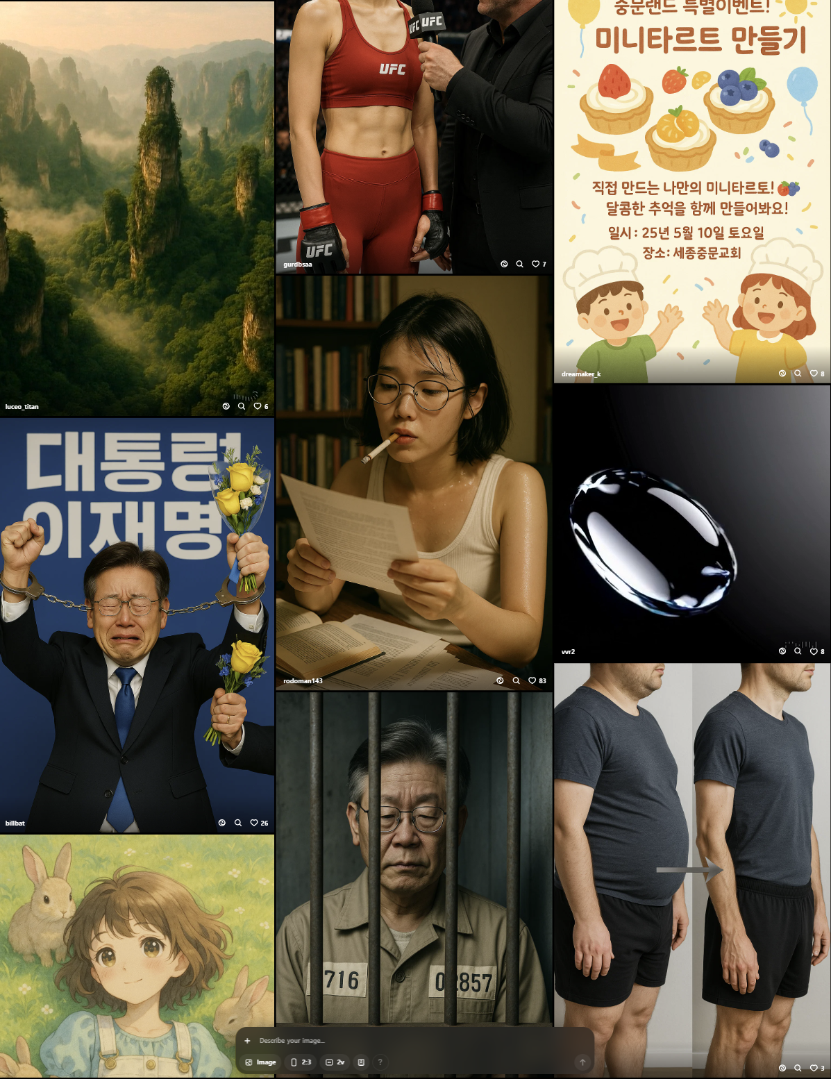 특히 지브리 열풍 이후 국내 사용자들의 급격한 유입은 AI 생태계에도 변화를 일으켰다. 연예인 이미지를 재구성하거나, 정치인을 패러디하거나, 과도하게 여성성을 부각시키는 콘텐츠, 한글로 도배된 광고성 이미지들이 플랫폼을 뒤덮고 있다.