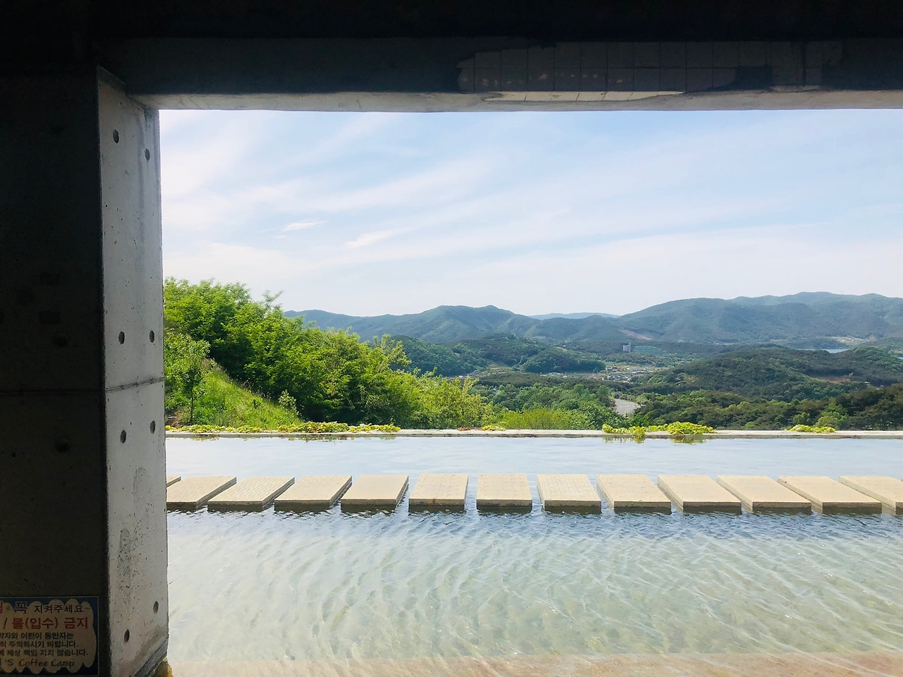 성주사터에서 멀지 않은 거리에 SNS에서 인기를 모으고 있는 카페 '갱스커피'가 있다. SNS에서 인기몰이를 하는 카페들은 접근성이 쉬운 편인데 이곳만큼은 운전에 집중을 해야할 만큼 올라가는 길이 가파르다. 산을 올라가면서 이 정도 높이에 있는 곳이라면 경치는 보장되겠구나 기대감을 잔뜩 품는다. 가는 길이 험할 뿐 주차공간도 넓고 날씨가 좋아서 그런지 사람들도 많다. 최근 젊은 세대에서 많은 사랑을 받는 카페의 건축디자인이 노출콘크리트다. 외벽을 별도의 장식으로 마감하지 않고 구조체인 콘크리트를 직접적으로 노출시키는 디자인이다. 처음 유행할 때야 신기하긴 했지만 근래에는 노출콘크리트의 카페 디자인이 워낙 많다 보니 질리는 맛이 있고, 오래도록 이어져오던 건물을 재활용하지 않고 새로 짓는 건축의 노출콘크리트는 작위적인 느낌 물씬이다. 그러나 갱스커피의 경우 허물어져가던 원래의 건물을 그대로 재활용하여 증축하여 카페로 운영 중인 곳으로 세월의 끈적한 생명력이 역력한 곳이다.