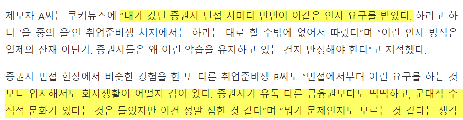 이러한 차렷/경례 인사는 취업 준비를 하면서 다시 경험할 수 밖에 없었다. 모 기업 면접에서는 면접관님들에 대한 예의를 갖춰야 한다는 일환으로 같은 면접조에서 누가 차렷/인사를 할 것인지 정하고 연습도 몇 차례 했으며, 심지어 연습 때 낙점된(?) 지원자의 차렷/인사가 마음에 들지 않을 경우 차렷/인사라는 구령을 외치는 사람이 바뀌기도 했다. 아래 기사를 보면 이러한 행태는 아직도 몇몇 기업에서 계속해서 이루어지는 것 같다. 오랫동안 차렷/인사에 익숙해진 면접관들은 그런 군대식 인사를 하지 않으면 예의 없다고 생각할 수도 있겠지만, 군대식 인사를 해야만 예의 바른 지원자가 되는 것은 아니라고 여겨진다.