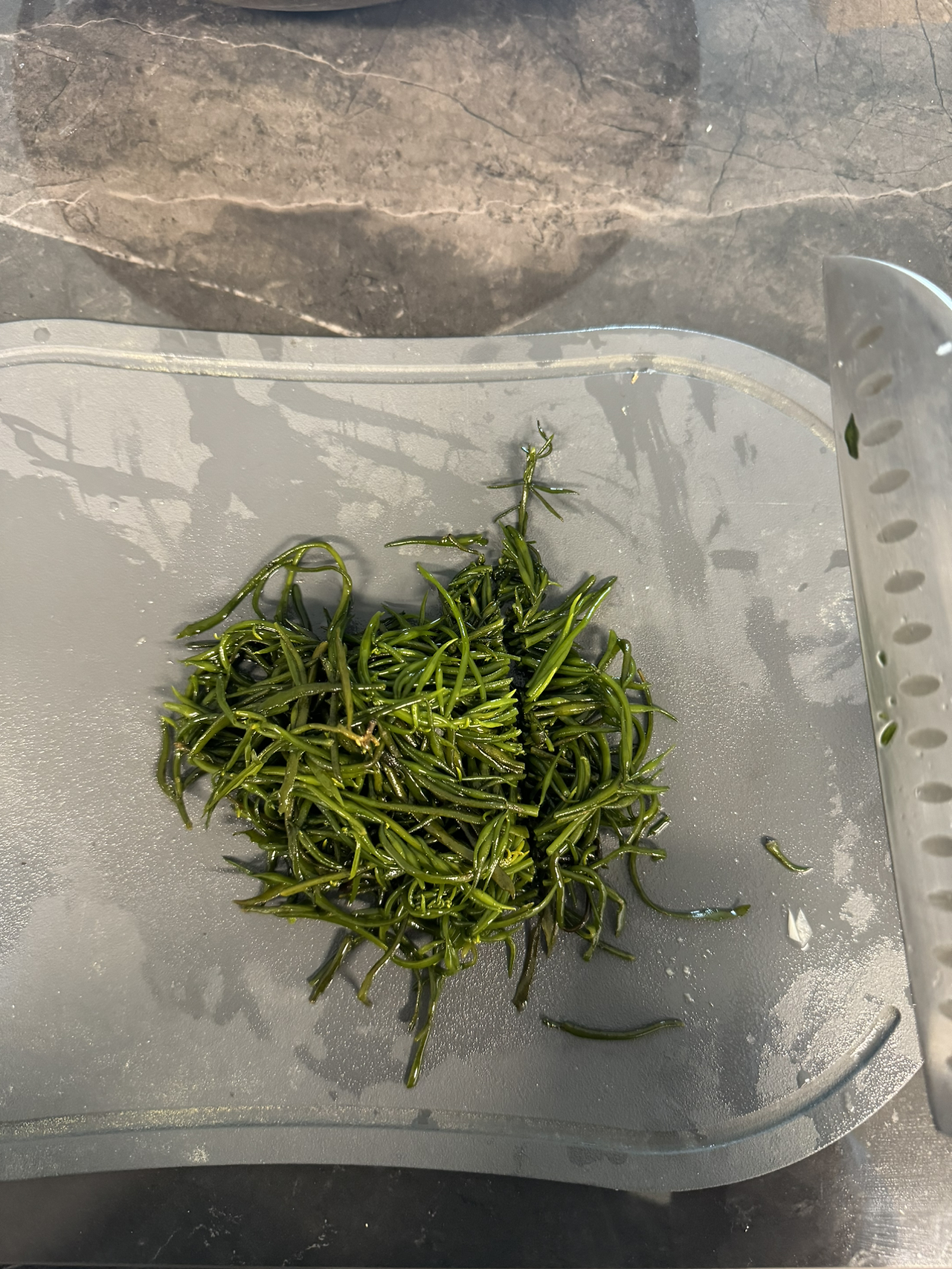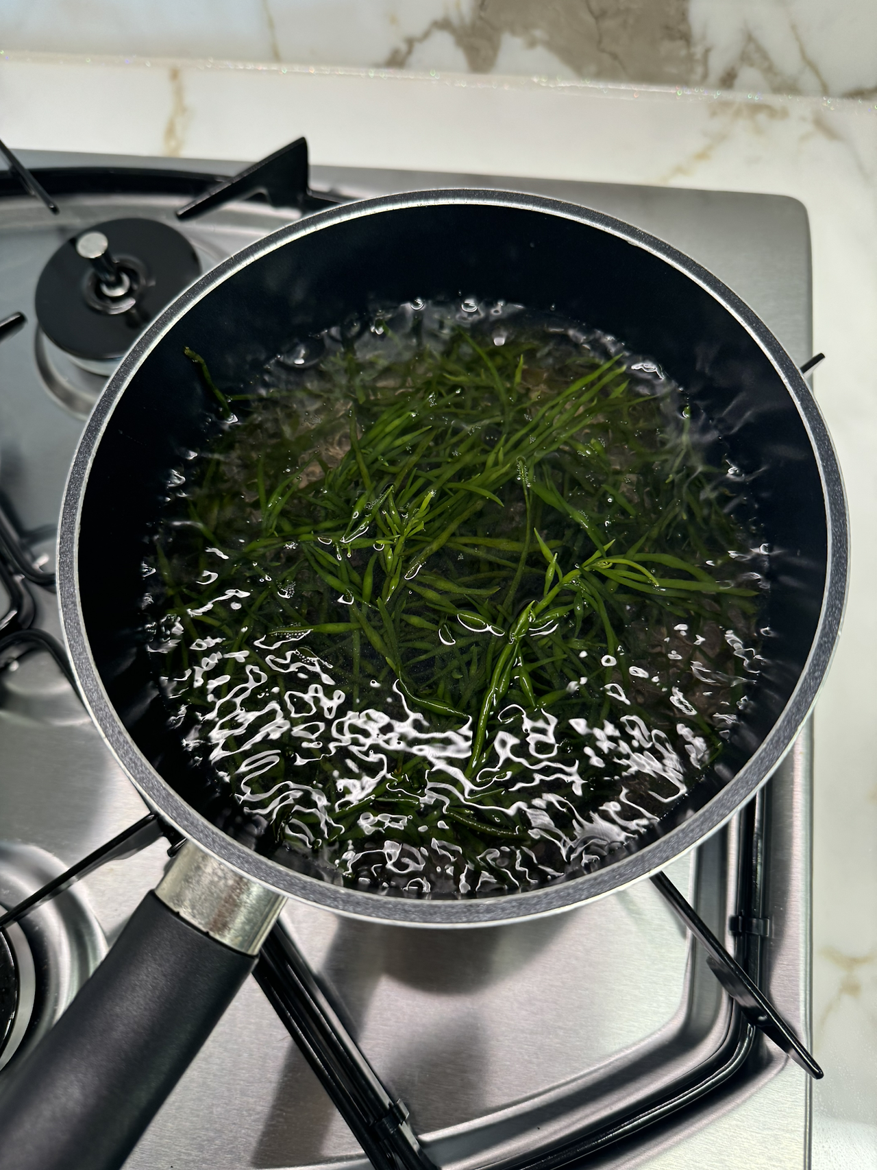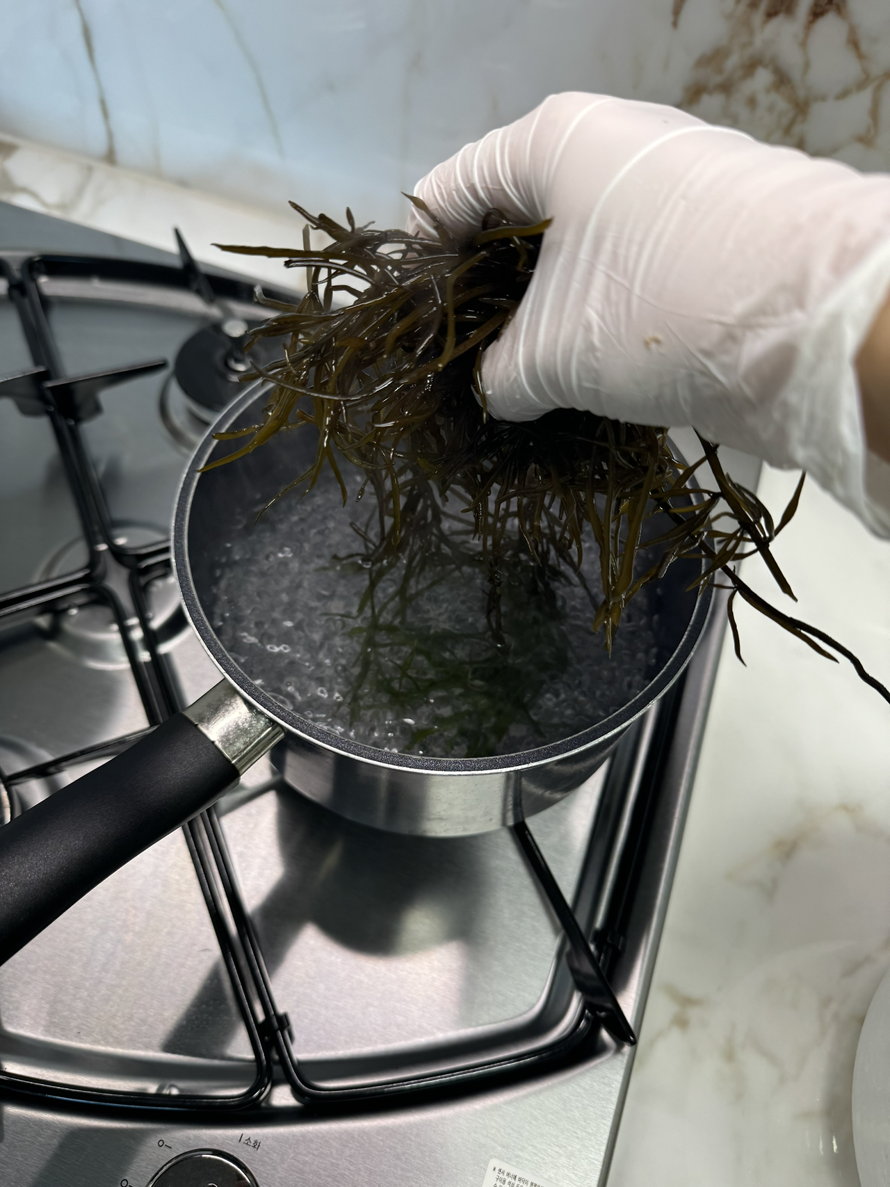 끓는 물에 톳을 넣으니 갈색빛에서 녹색빛으로 색이 변하는데 이 모습이 진경이다.