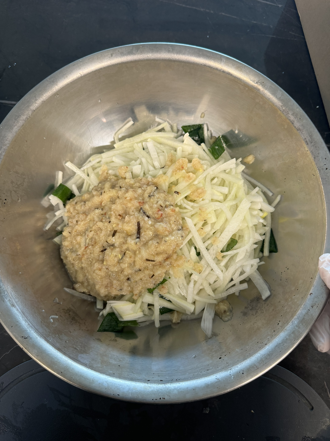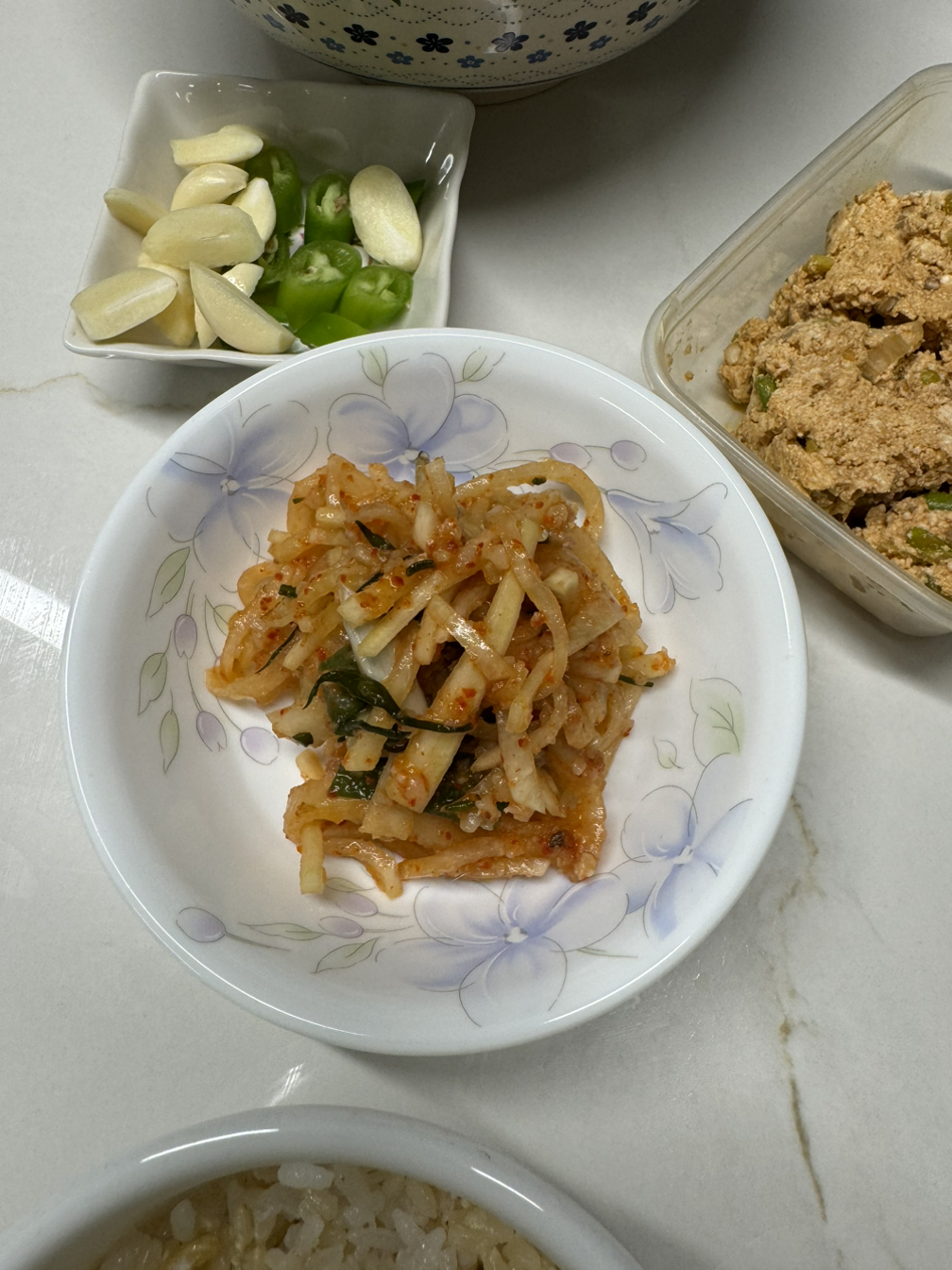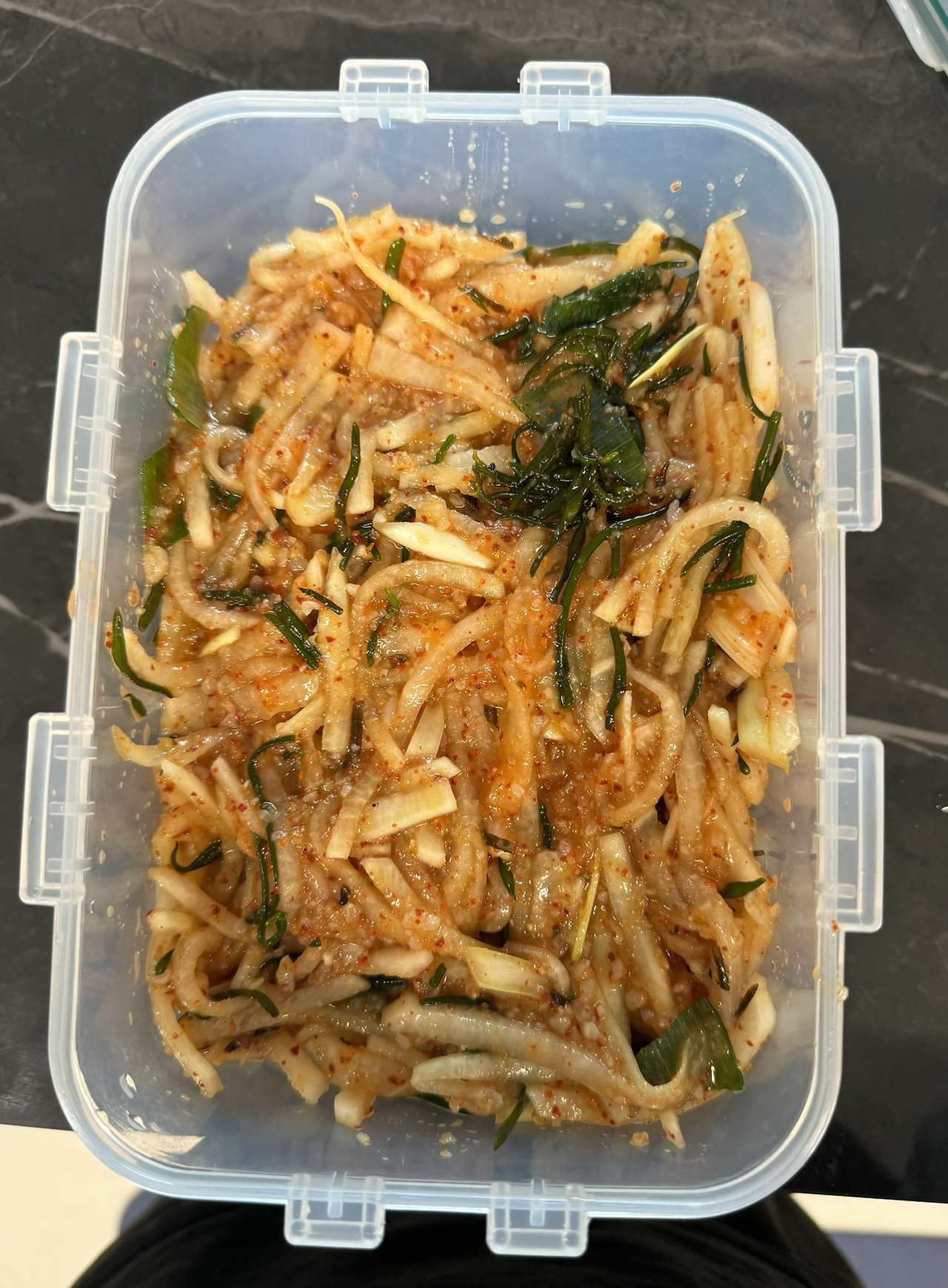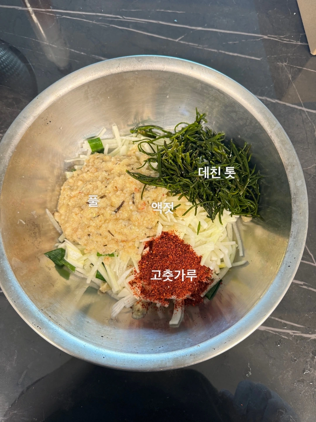 한때는 절인무에 고춧가루만 넣고 먹었었다. 그러다 깍두기를 만들 때 풀을 넣은 경험으로 풀을 넣으면 입에 넣을 때 촉촉한 식감을 느낄 수 있어서 풀을 자주 이용한다.