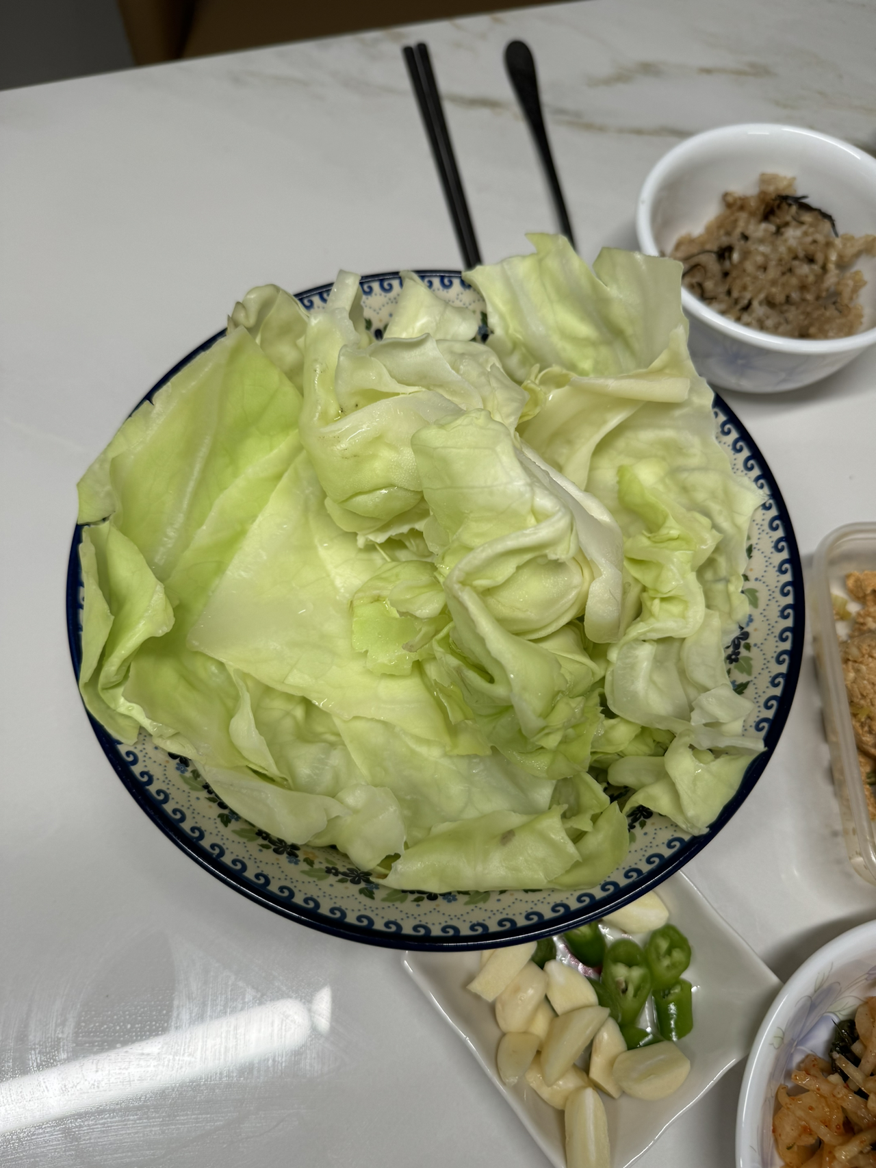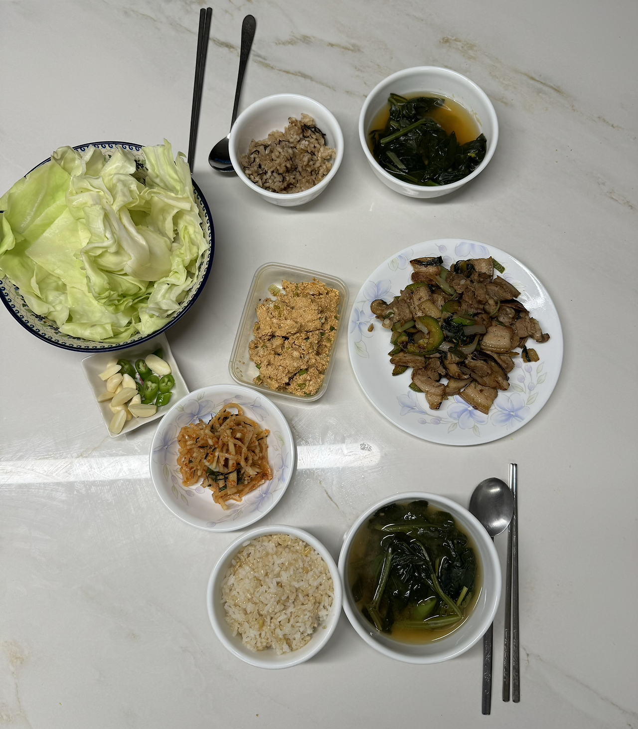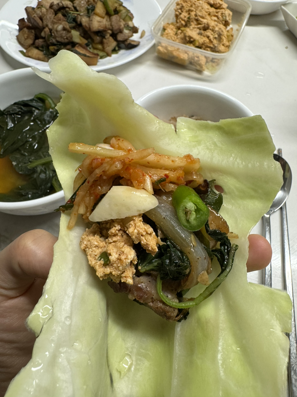 고기를 굽고 전자레인지에 양배추를 익히고 두부쌈장등과 함께 한상을 차렸다.