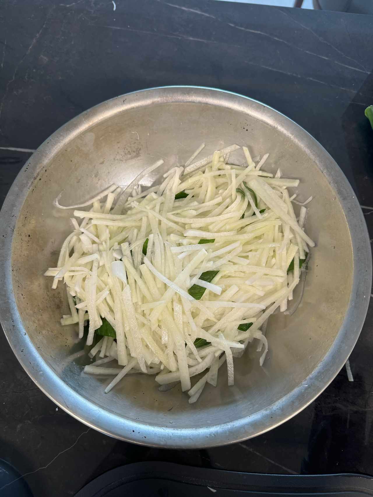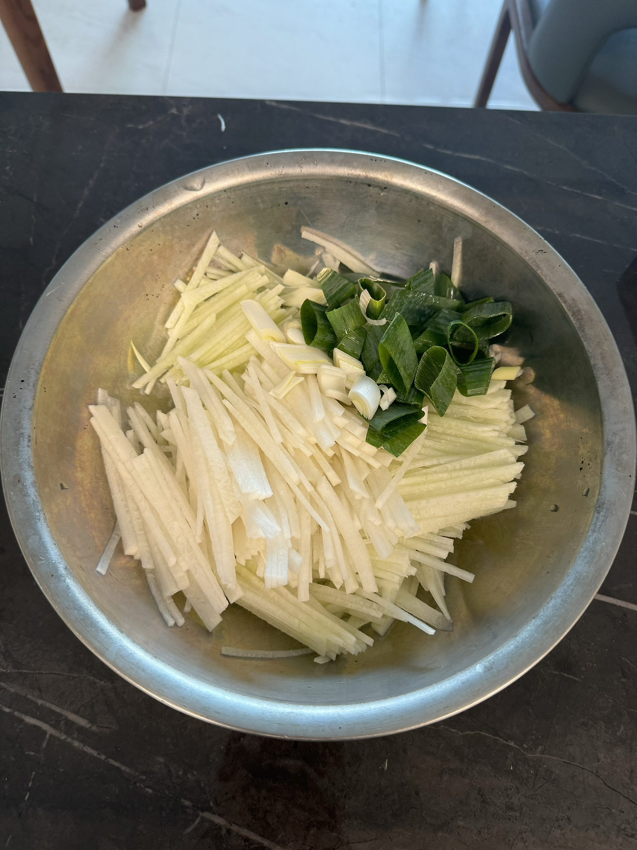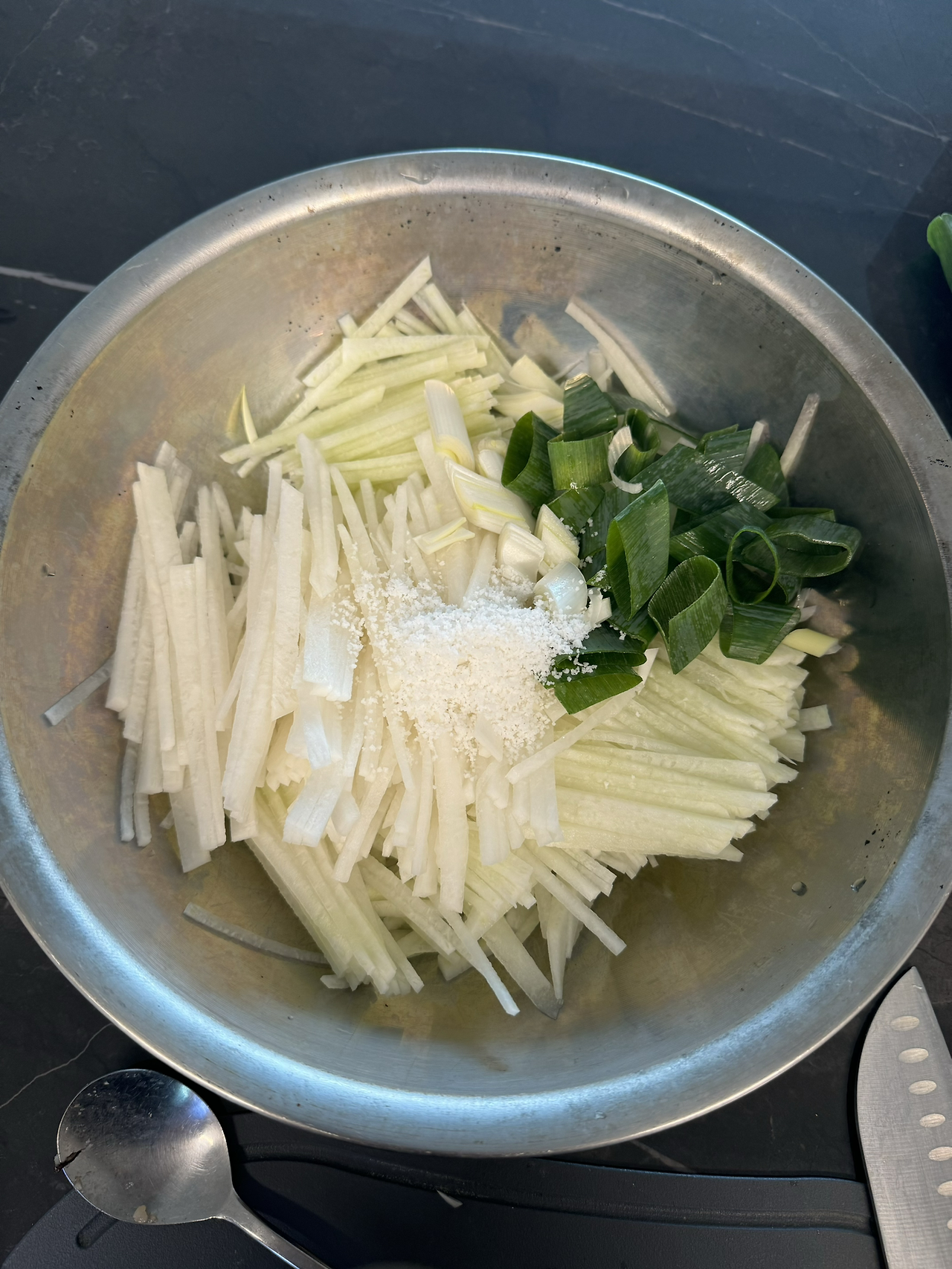 소금은 간을 배게하는 목적이 아닌 숨을 죽이고 무의 단맛을 끌어올리는 용도로 넣어준다. 여기에 대파등을 넣고 버무려도 좋지만 톳나물을 넣어보면 어떨까 싶어 넣어보았다.