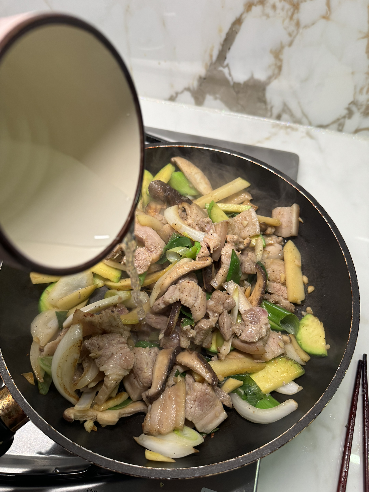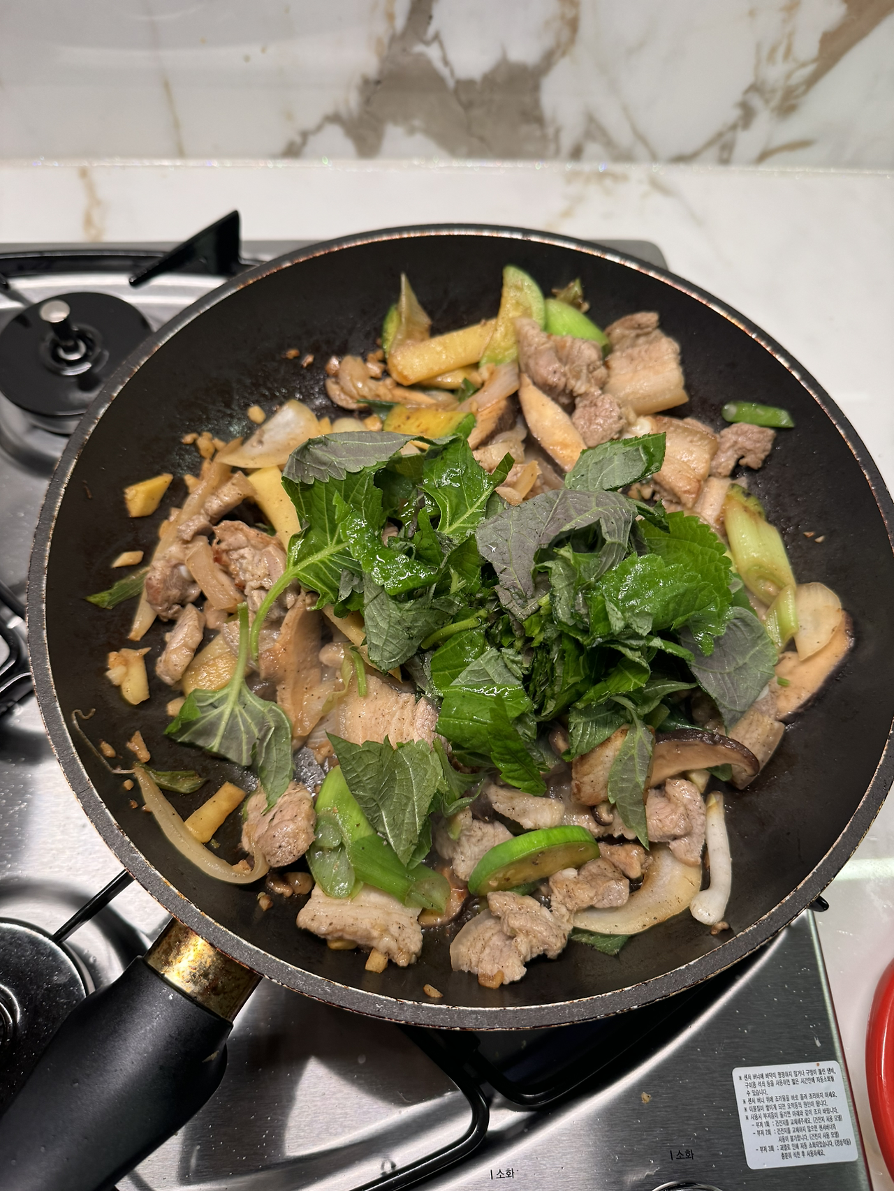 삼겹살을 구이를 할까 하다가 볶음으로 해서 채소도 같이 먹을 수 있게 만들어 봤다. 구운 채소는 향이 좋고 영양소 흡수율이 좋다.