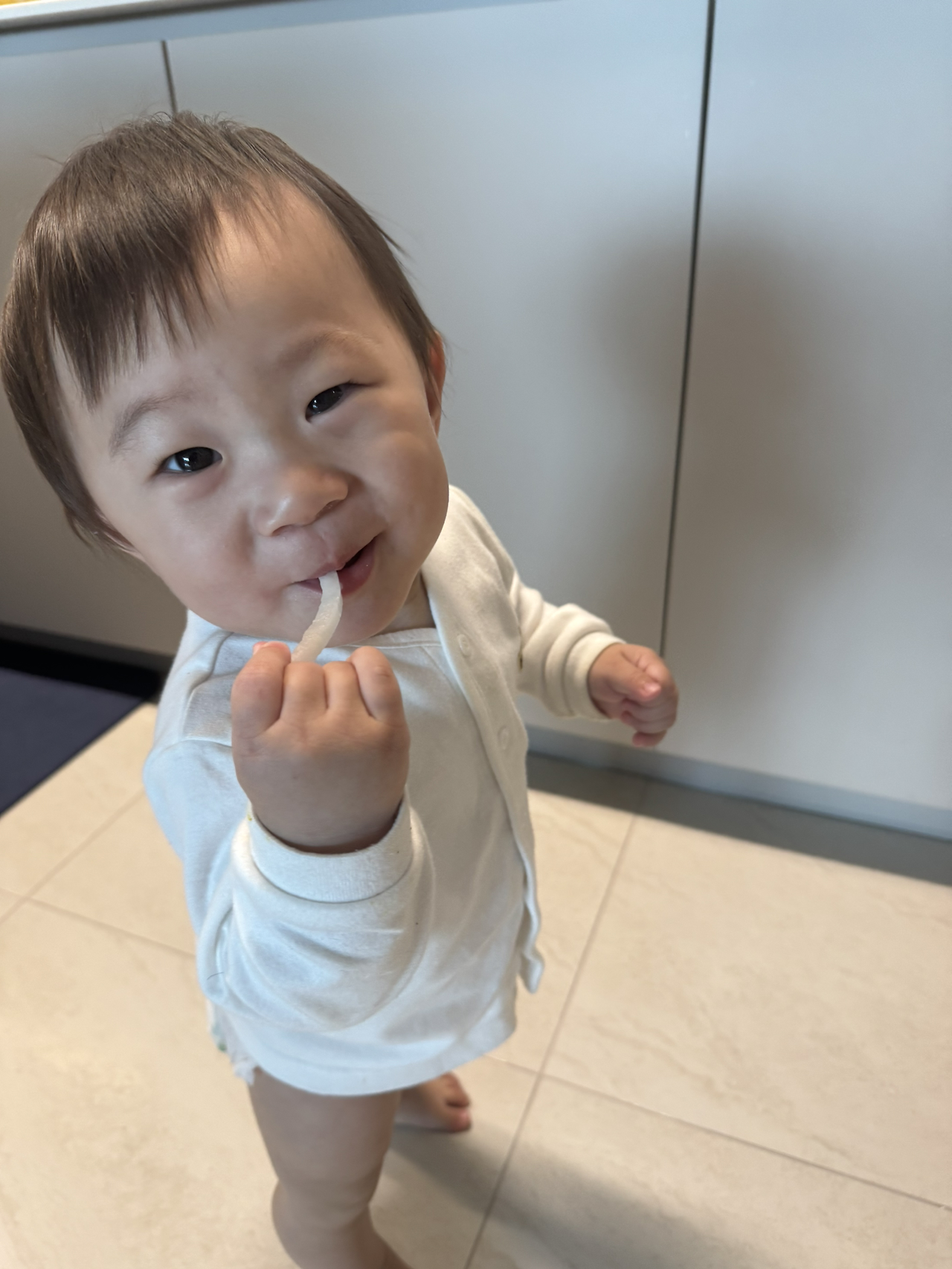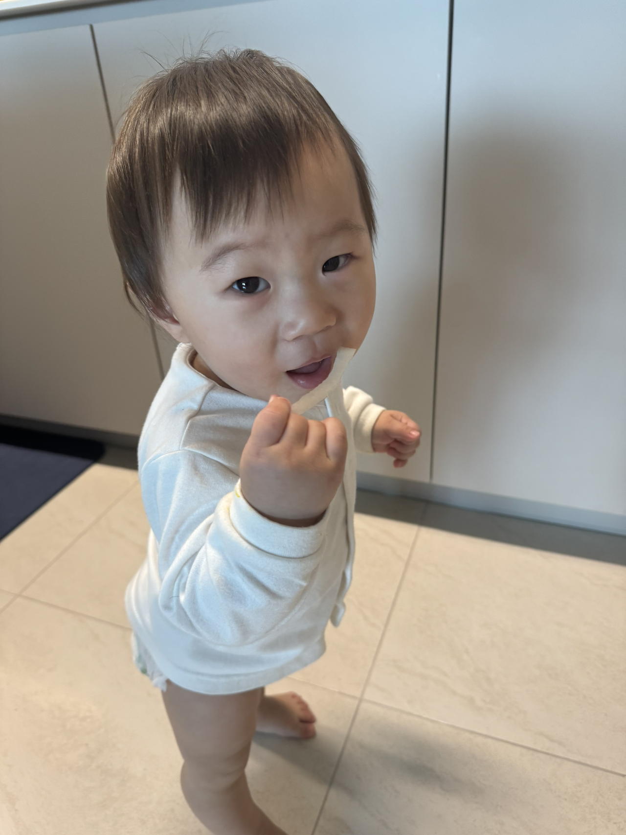 음식을 만들고 있으면 주용이가 관심을 가진다. 하루의 대부분을 주방에서 보내는데, 밑에서 뽈뽈뽈 돌아다니며 노는 주용이에게 무를 쥐어줬다.