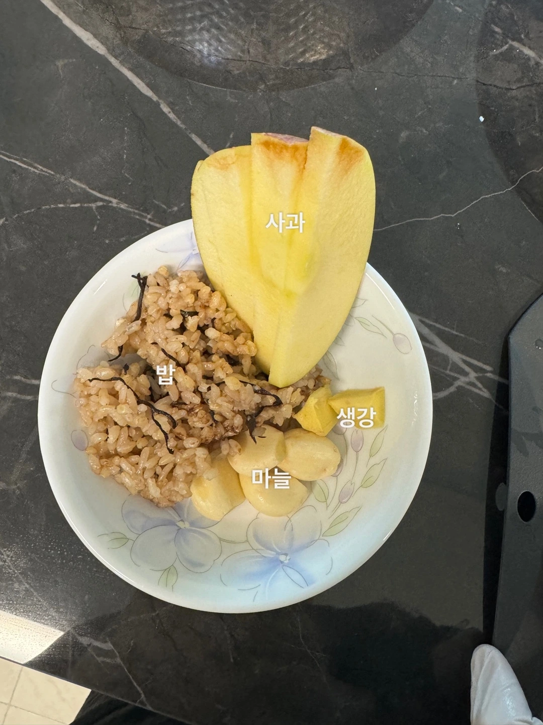 평소 무생채를 간단하게 만들어 먹는 편이지만, 가끔 풀을 넣어 만들기도 한다. 밥과 마늘, 생강 그리고 단맛을 책임져줄 사과와 소량의 물을 믹서에 갈아줬다.