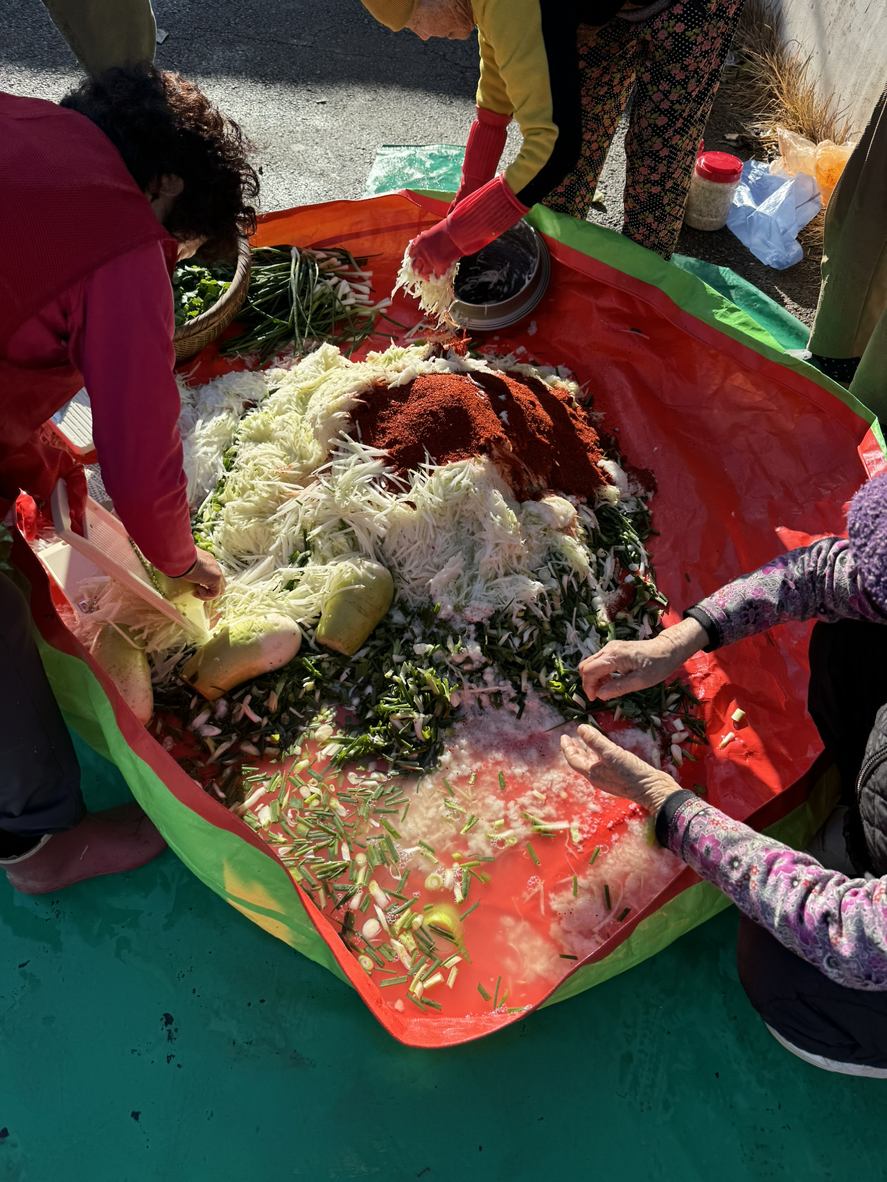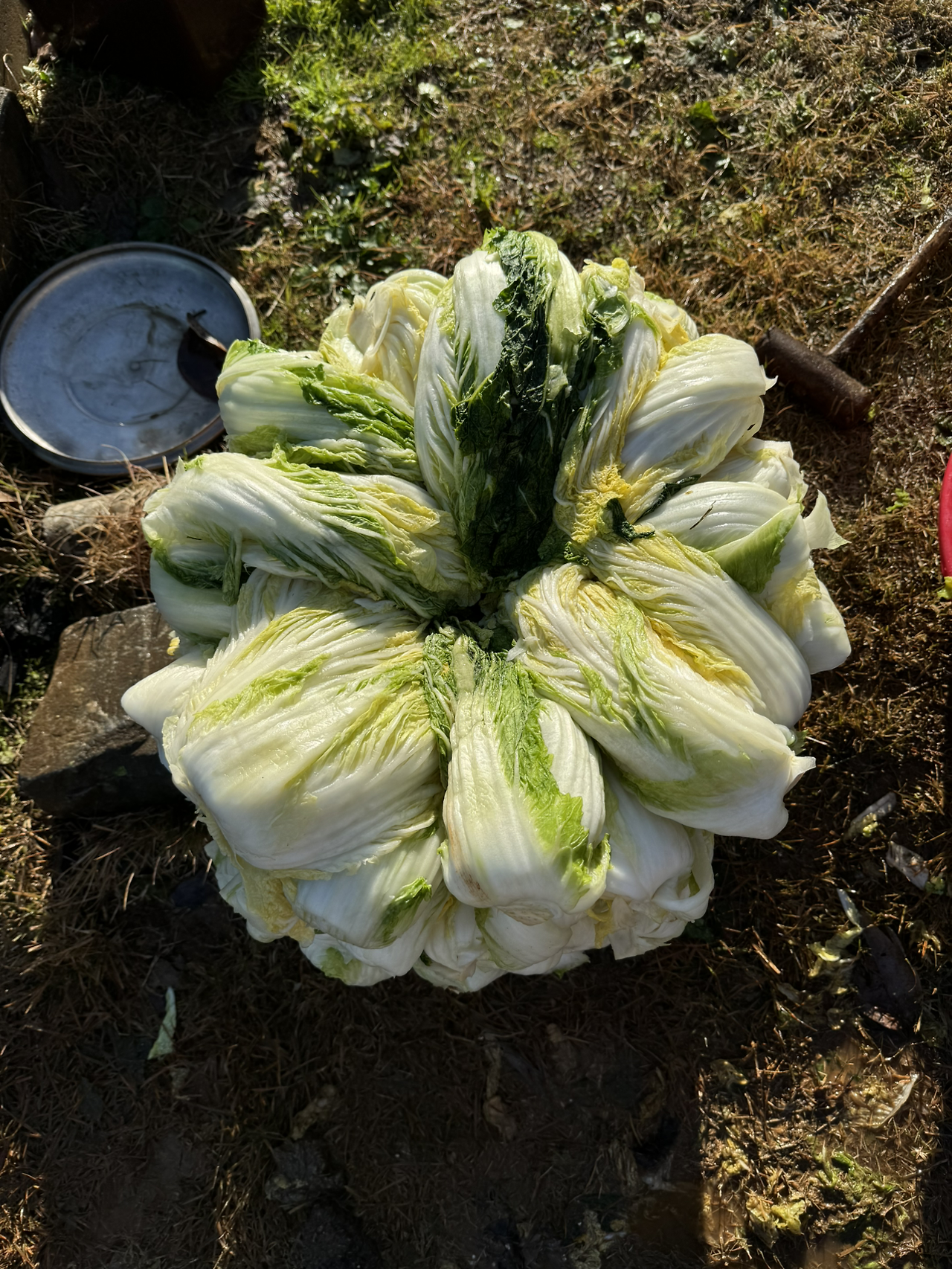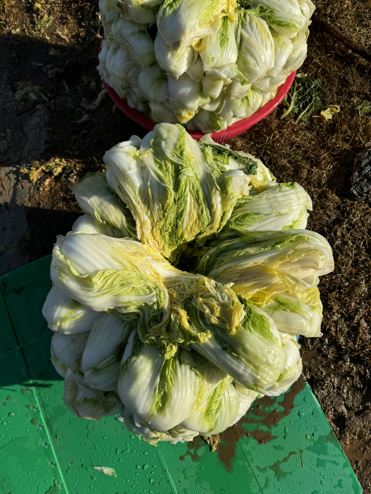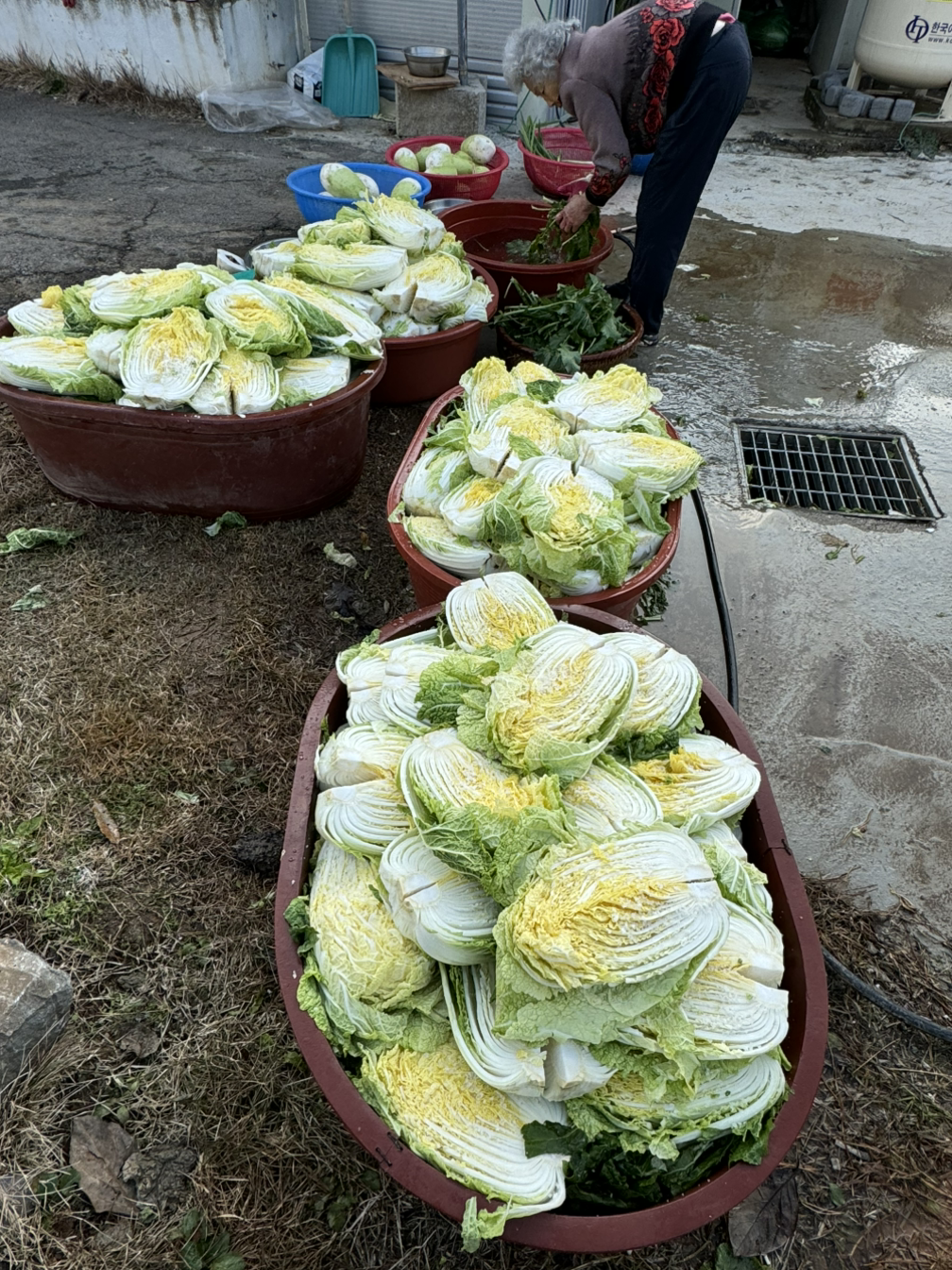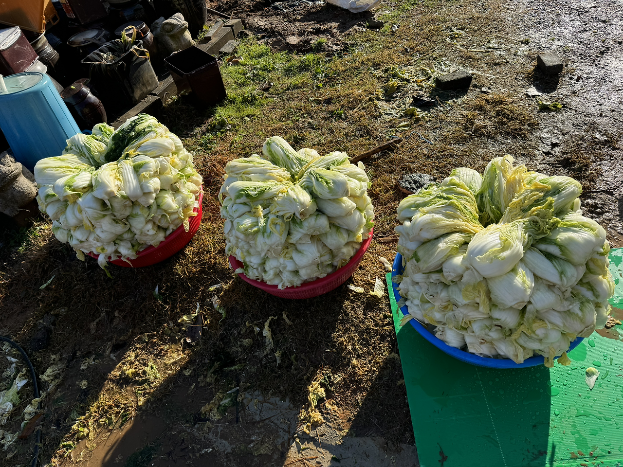 배추를 뽑고, 가르고, 절이고, 뒤집어서 절이고,