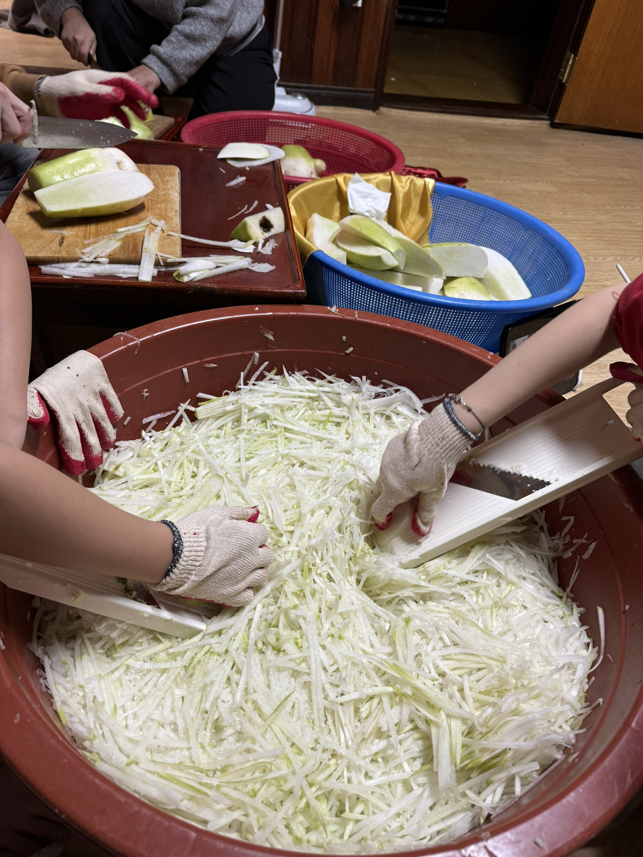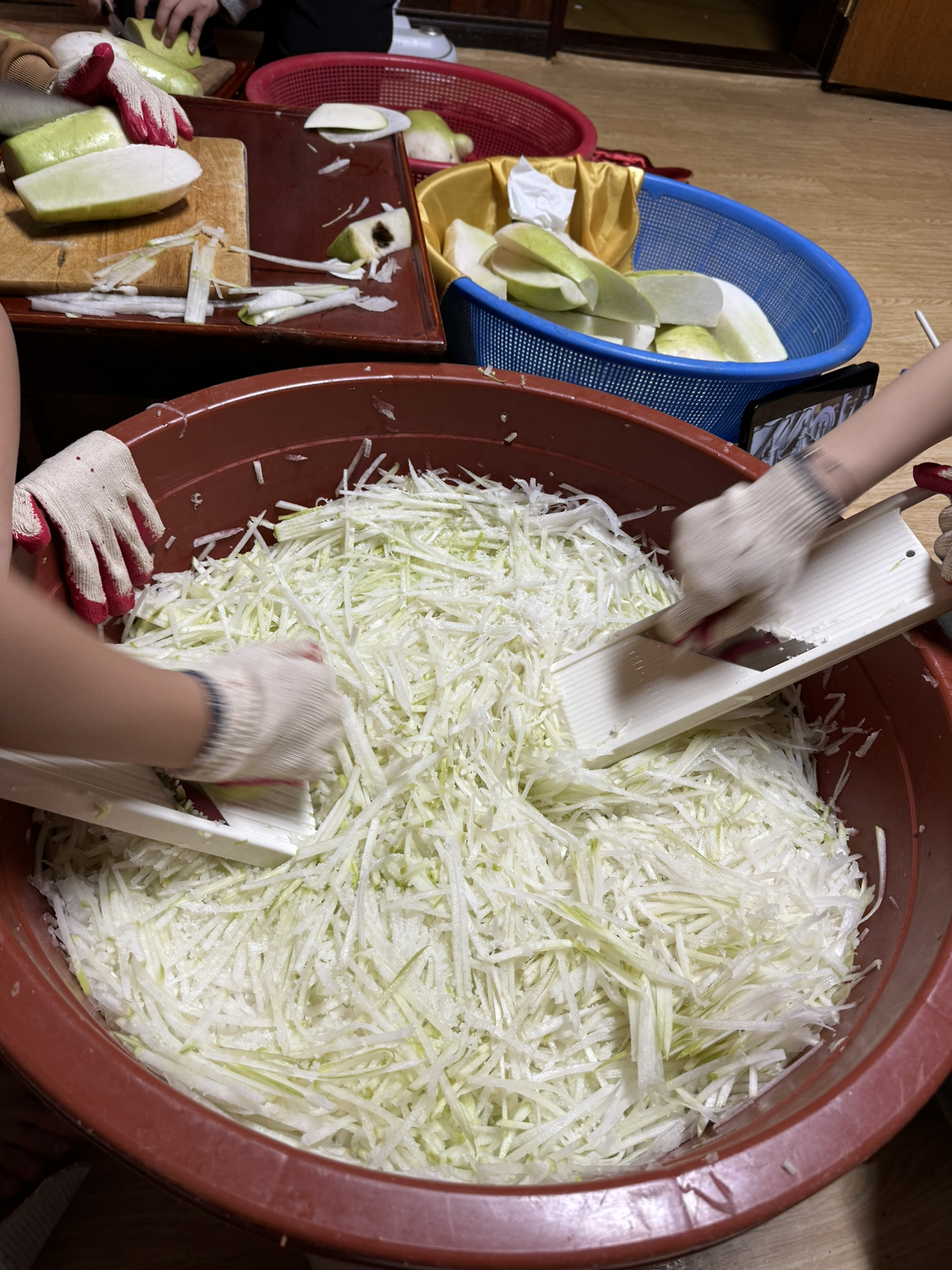 다시 씻겨 소금물에 절이고, 속재료를 만들고 등은