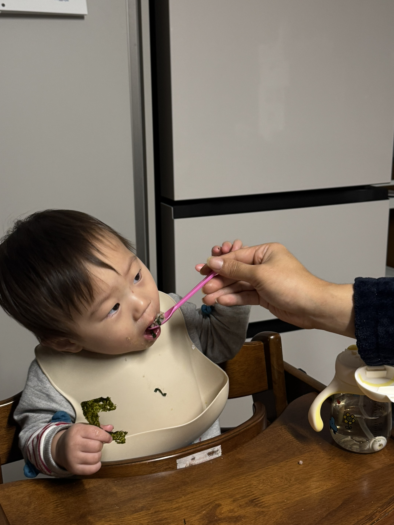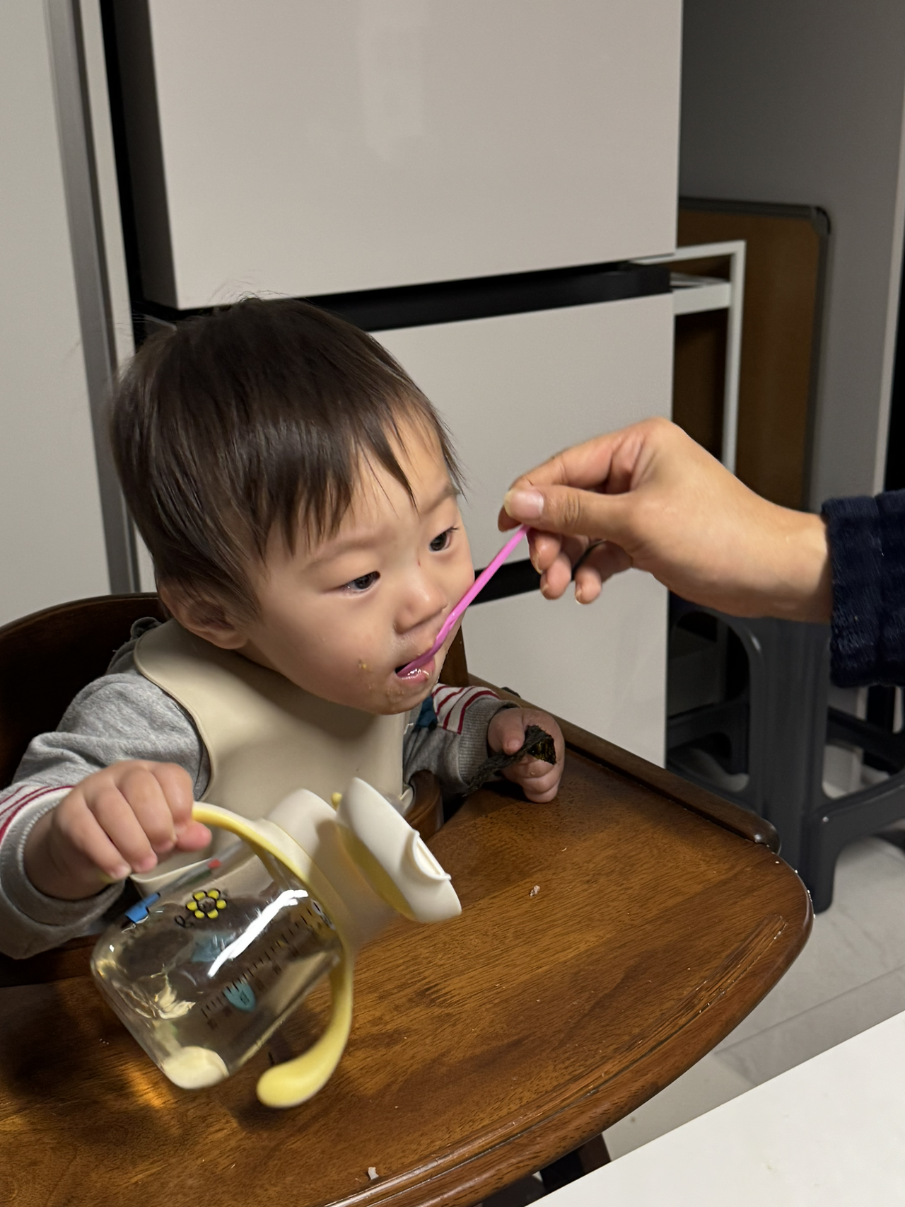 밥 먹이는 것을 도와주는 남편에게 감사하다.