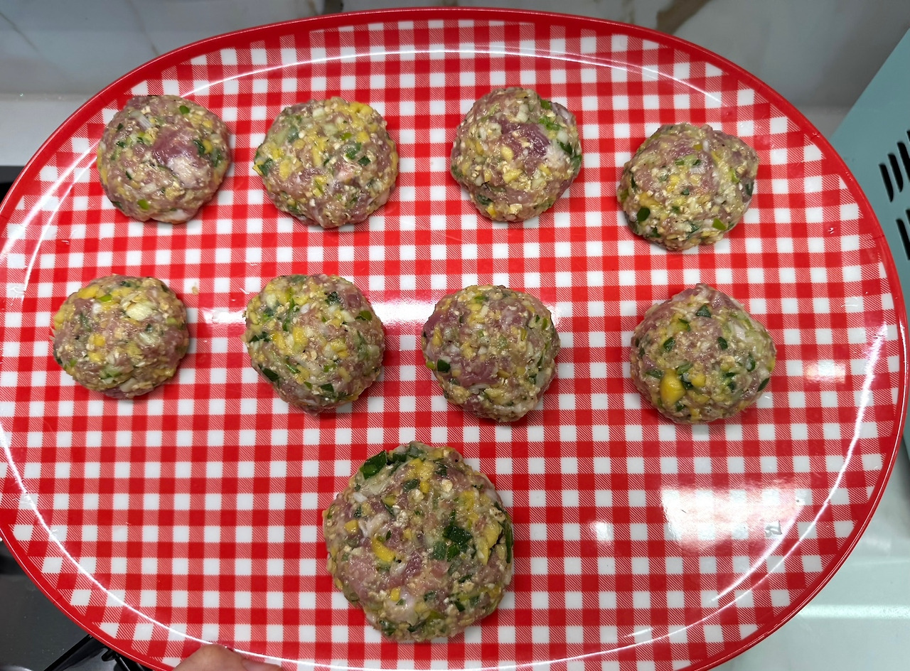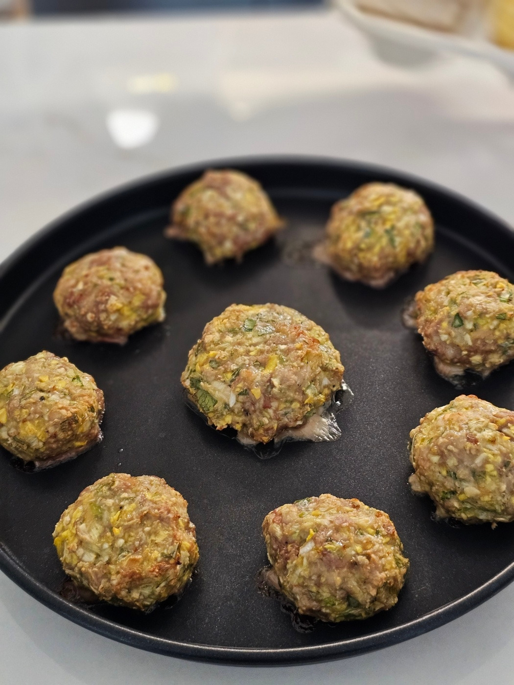 한 손에 잡아서 먹는 걸 좋아는 주용이를 위해, 한 손 가득 잡을 수 있는 크기로 빚어보았다. 완자를 만들 때 동그랗게 굴리지 않고 손을 동그랗게 말고 손바닥에 내려치면 잘 풀리지 않는 완자 만들기가 가능하다.
