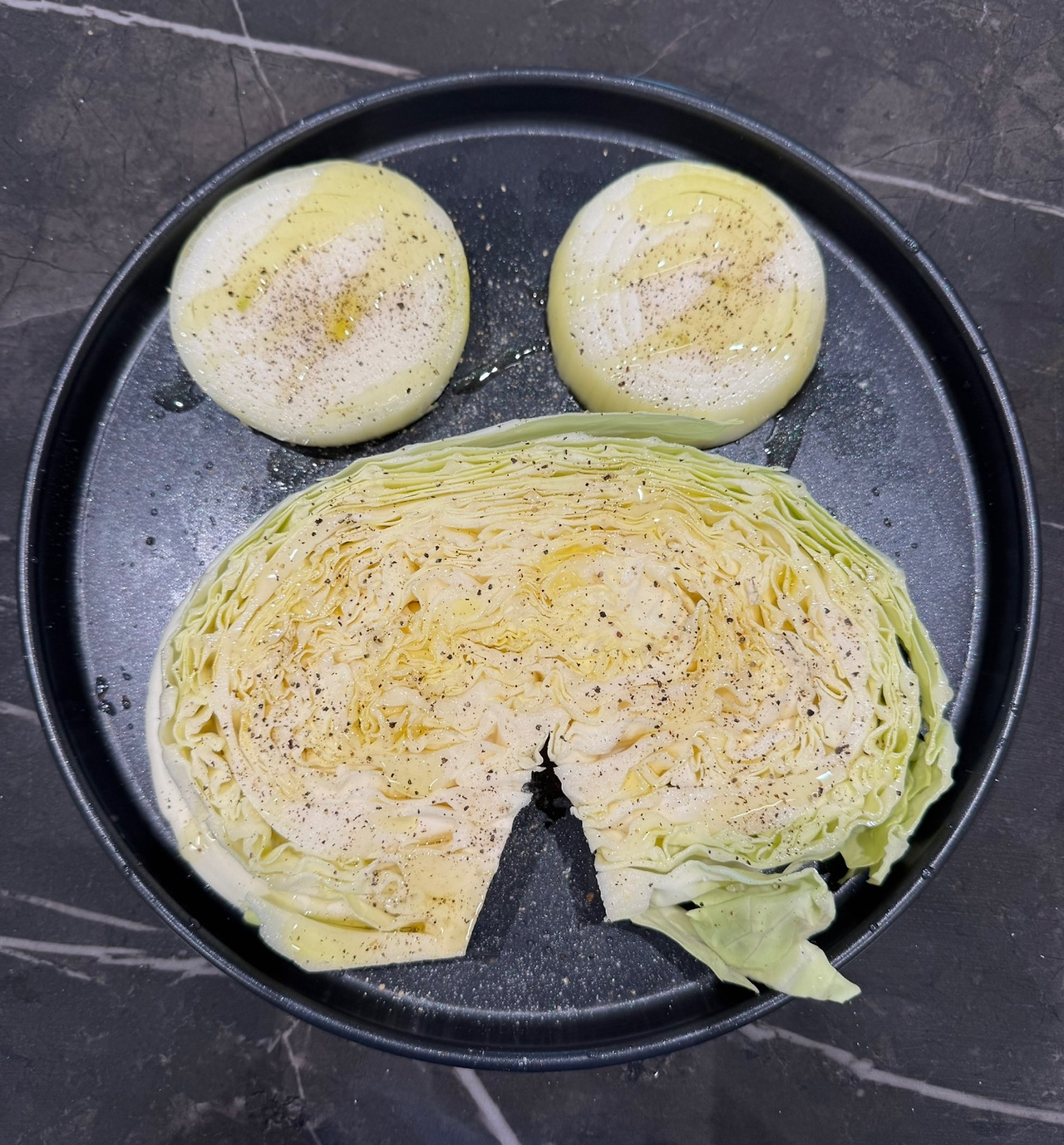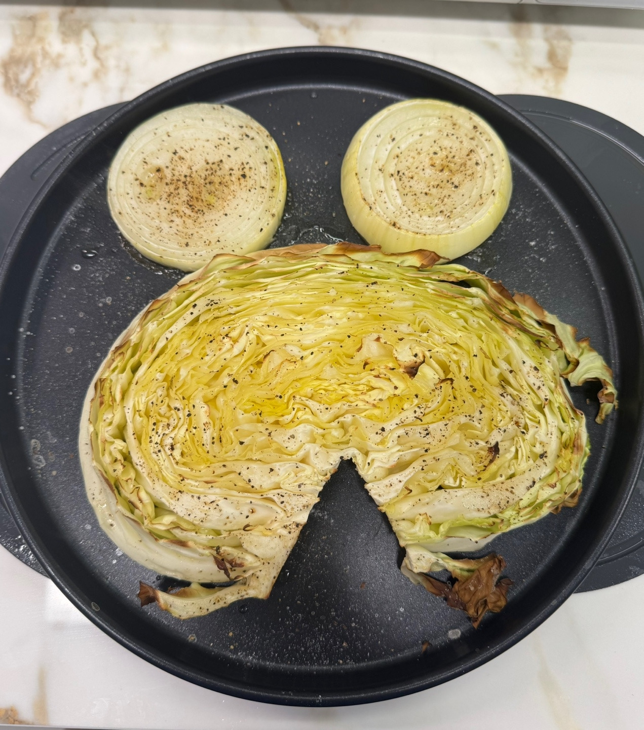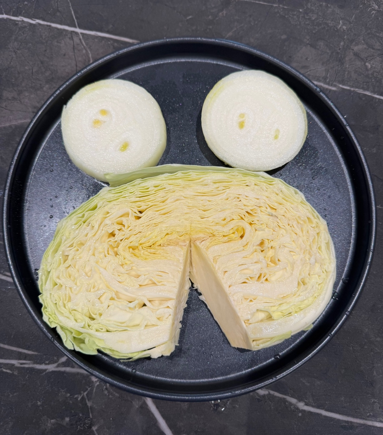 양배추는 내가 애용하는 채소다. 먹고 나면 갈증이 사라지고 속이 건강해지는 기분이 든다. 볶아먹거나 쪄서 쌈을 싸 먹어도 좋고 크게 잘라 오븐에 구워 스테이크처럼 먹어도 괜찮다. 양파와 함께 놓으니 귀여운 표정이 만들어진다.