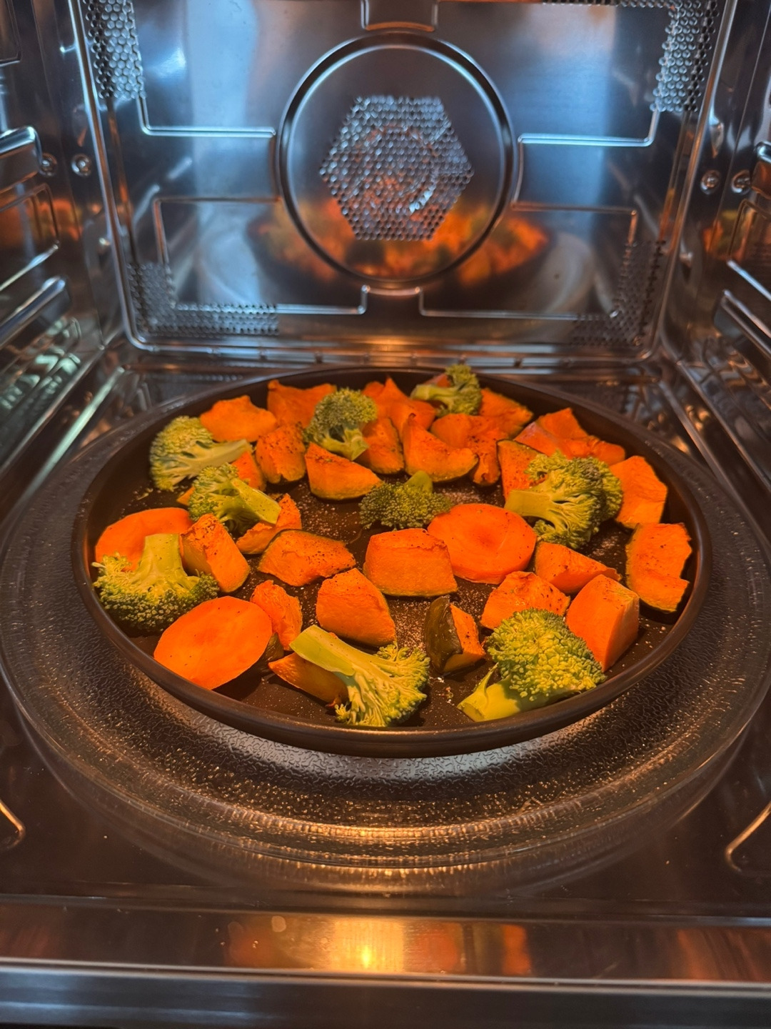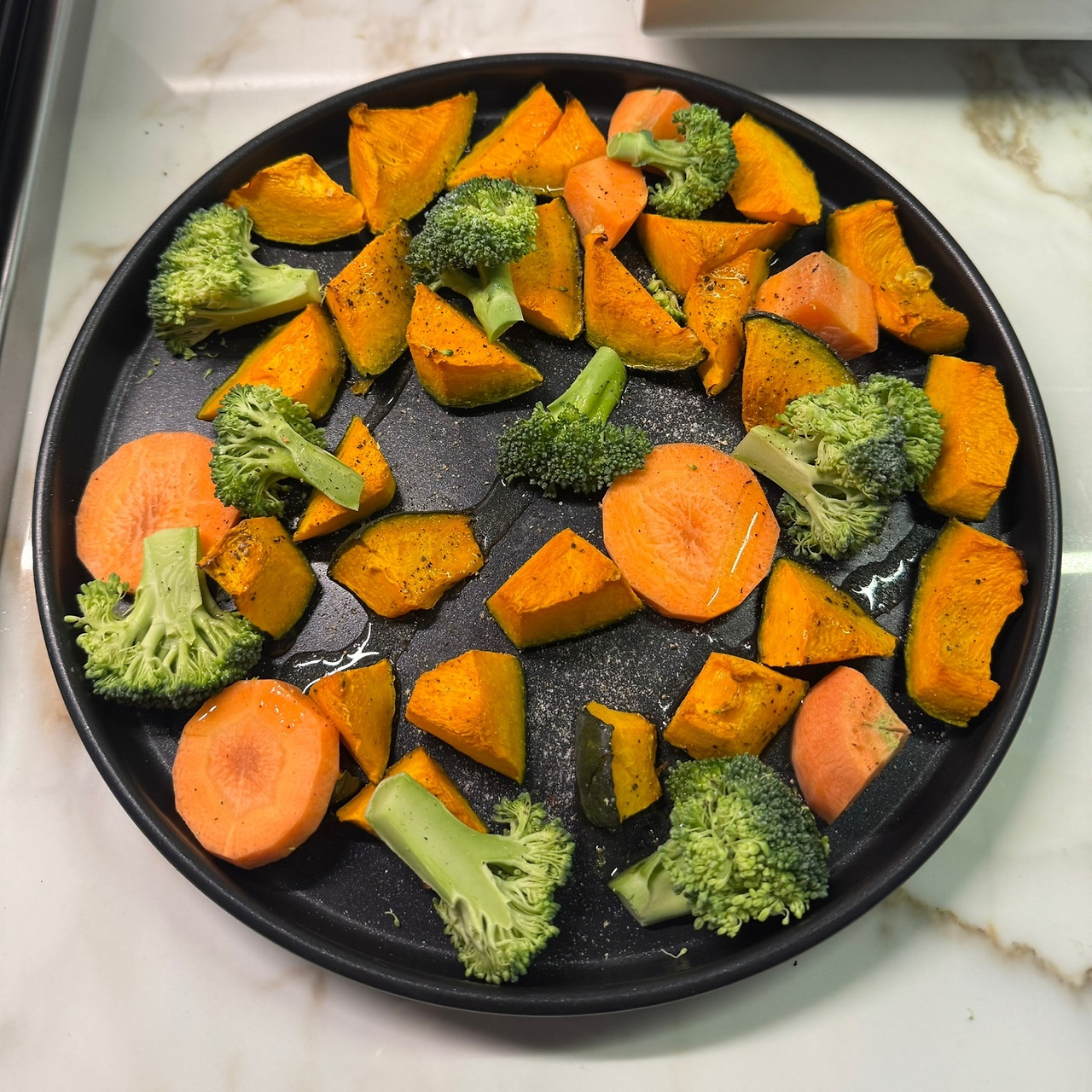 단백질섭취도 중요하지만 식이섬유는 쾌변에 있어 중요한 역할을 담당한다. 먹는 것과 먹지 않는 것의 장운동과 속편함도 다르고 식사 후의 만족감이 다르다. 식사를 하기 전 음식을 준비할 때 조금씩 주전부리처럼 채소를 먹기도 하지만 생채소보다는 익힌 채소가 영양흡수율이 좋고, 소화에도 도움이 되기 때문에 오븐에 채소를 구워보았다.