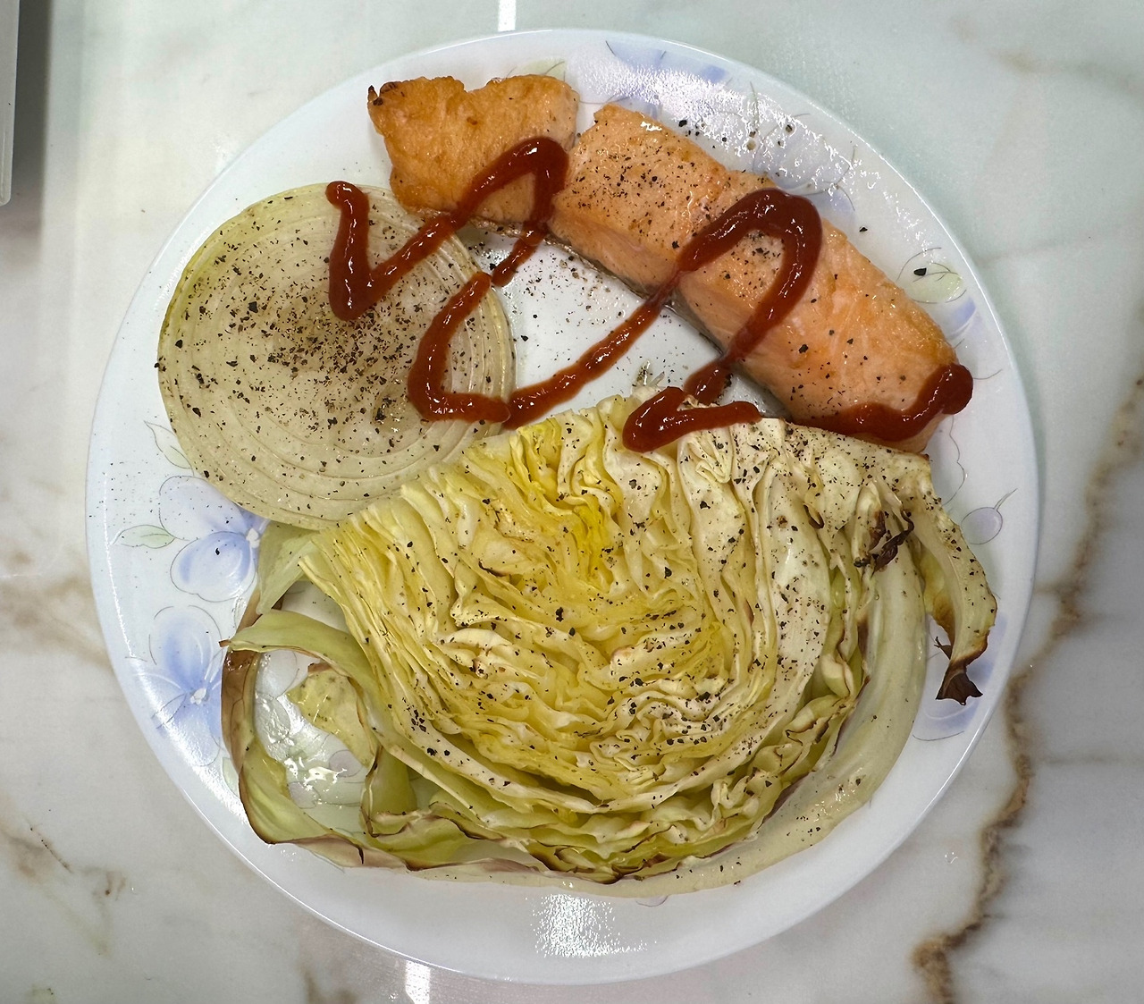 생선을 익힐까 하다가 냉동실에 마지막 남은 연어가 생각났다. 전자레인지에 돌려 같이 준비해 스리라차소스를 뿌려 먹으니 맛있다. 요즘 스리라차소스에게 신세를 지고 있는데 대부분 소금과 후추로만 간을 하고 있어서 좀 더 자극적인 맛을 느끼고 싶을 때 같이 먹는다.