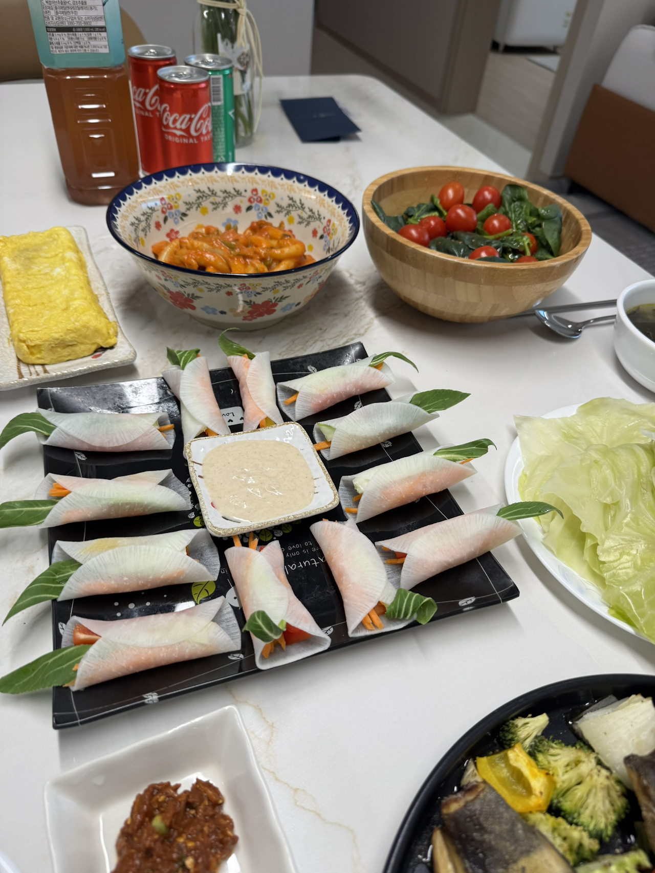 손님 초대상을 차려본지가 꽤 되어서 인터넷을 뒤져봤다. 갈비찜, 샤브샤브, 잡채, 무쌈말이등 여러 음식들이 검색되었는데 그중 무쌈말이가 색감도 알록달록 예쁘고 내 취향이었다. 재료도 간편한 편이고 다른 음식들은 냉장고에 있는 재료와 장을 봐서 상을 차렸다.