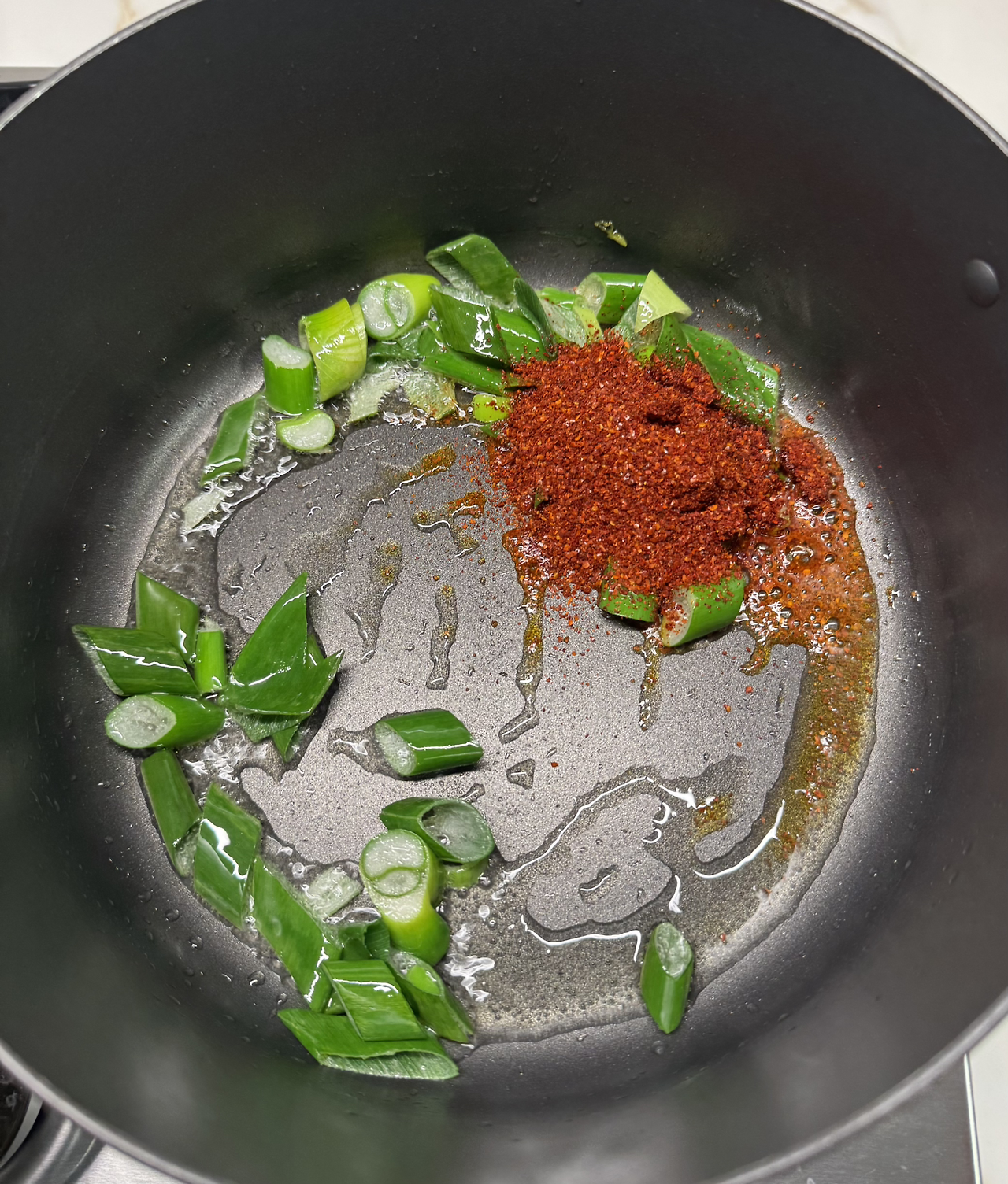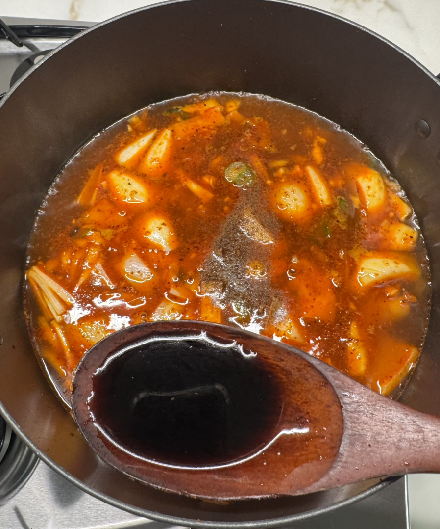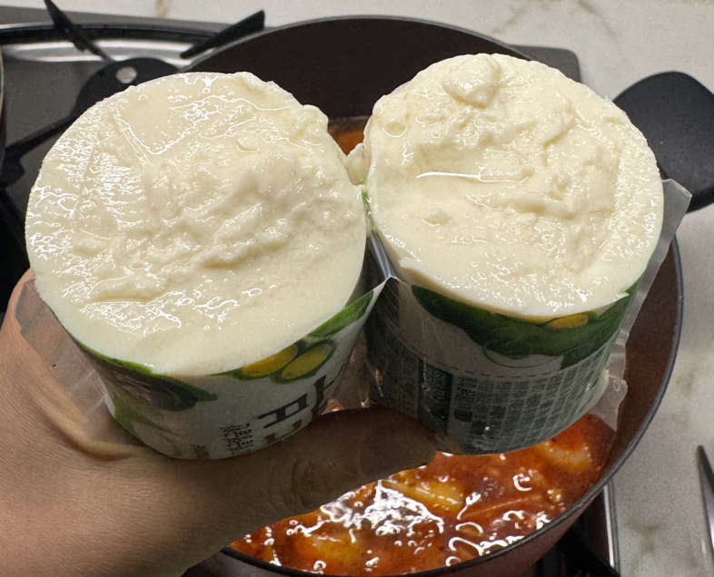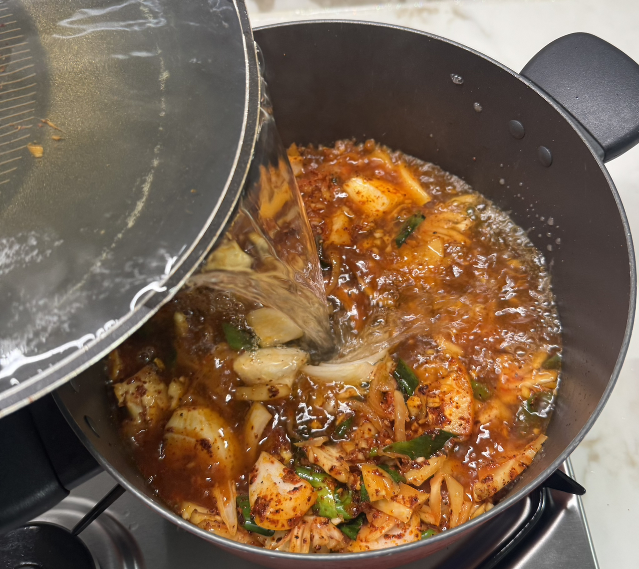 순두부찌개양념을 마트에서 파는 것을 넣을까 하다가 직접 고추기름을 내봤다. 이 작업을 해줘야 칼칼한 순두부찌개가 만들어진다. 육수는 다시팩을 넣어 미리 끓여 만들어준다.