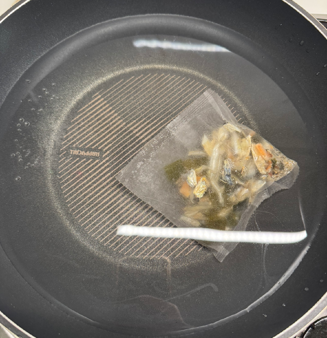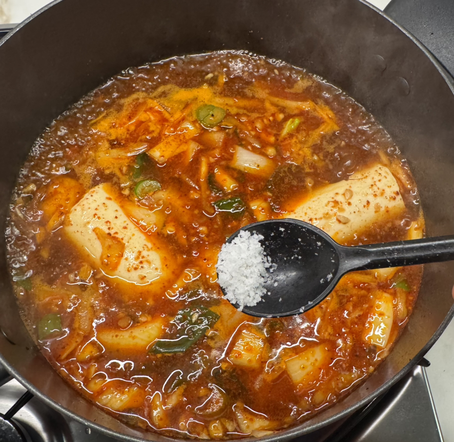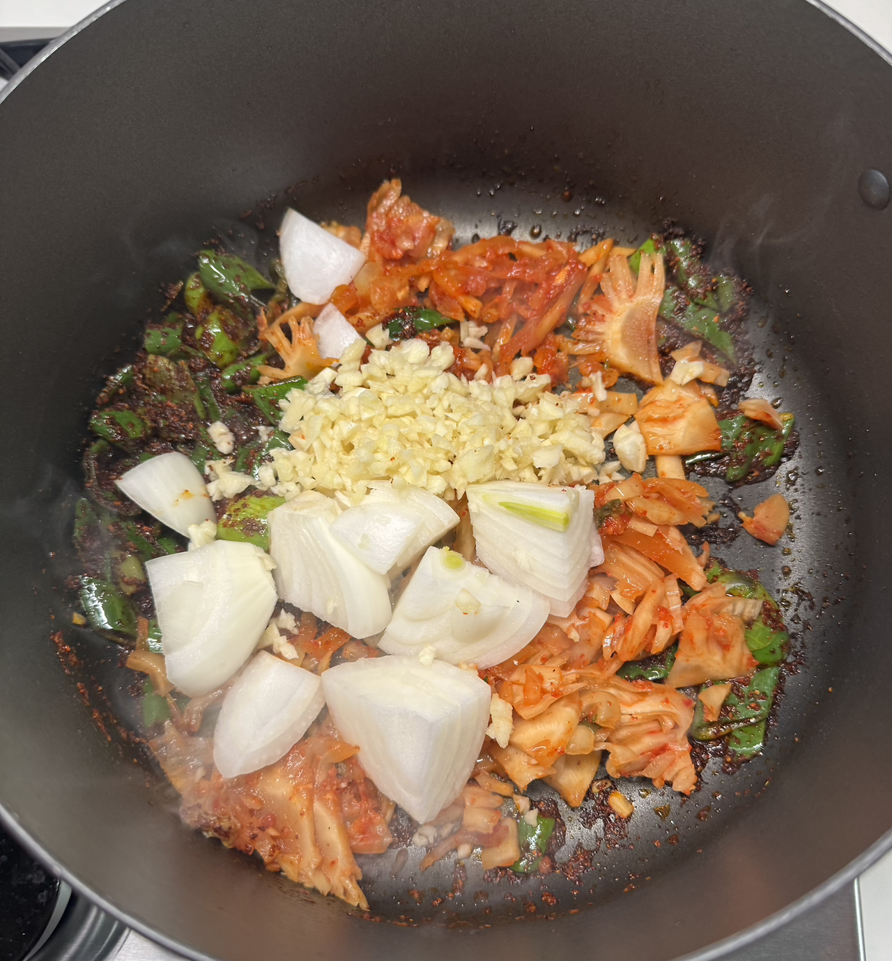 순두부찌개양념을 마트에서 파는 것을 넣을까 하다가 직접 고추기름을 내봤다. 이 작업을 해줘야 칼칼한 순두부찌개가 만들어진다. 육수는 다시팩을 넣어 미리 끓여 만들어준다.