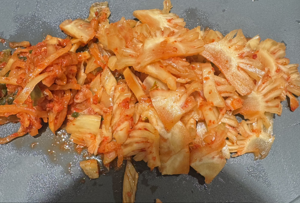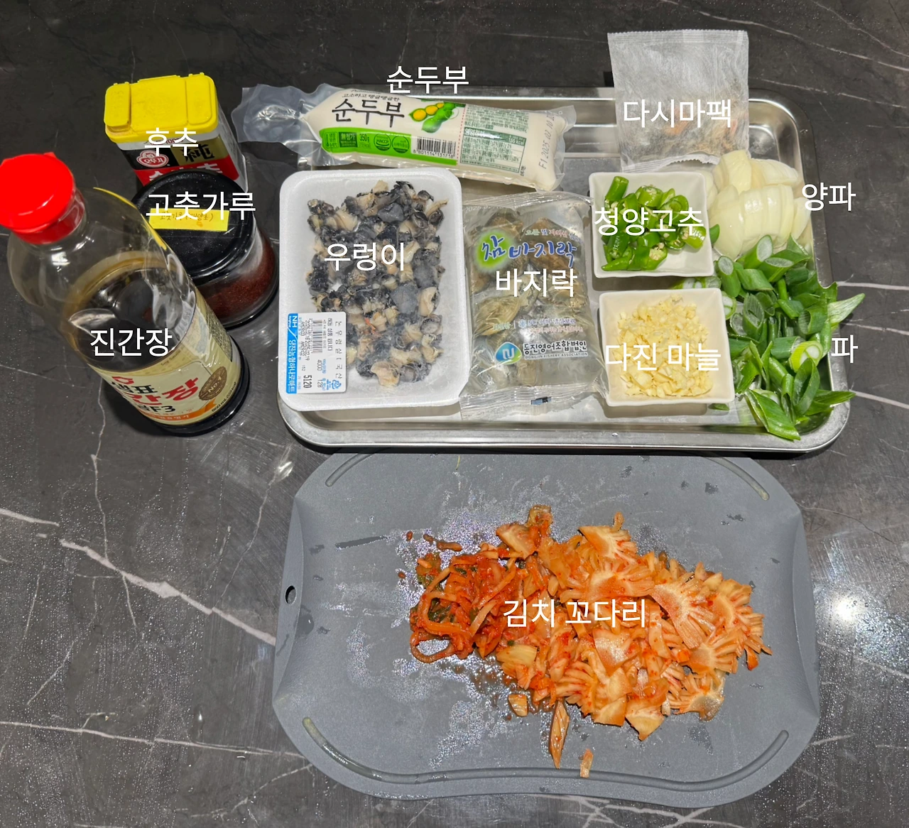 순두부찌개에 들어갈 김치는 김치 꼬다리로 준비했다. 따로 통에 잘 모아두었다가 두부랑 같이 먹으면 아삭아삭하니 맛있다. 가끔 찌개를 끓일 때도 사용하는 편인데 김치 꼬다리를 넣어주면 국물이 시원해진다고 한다.