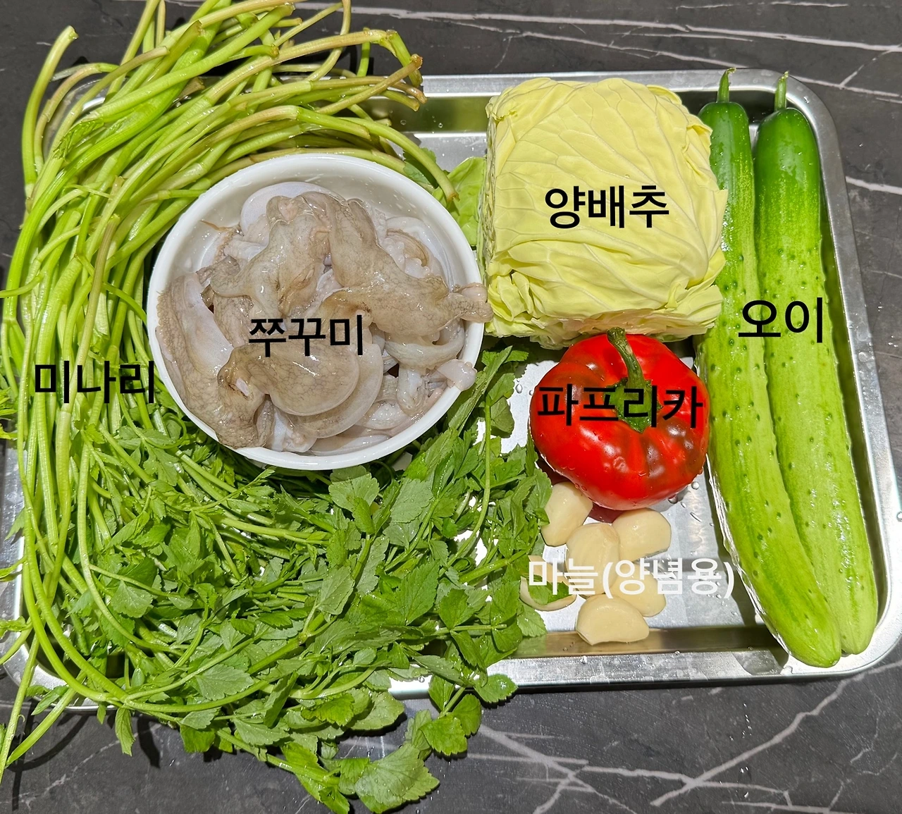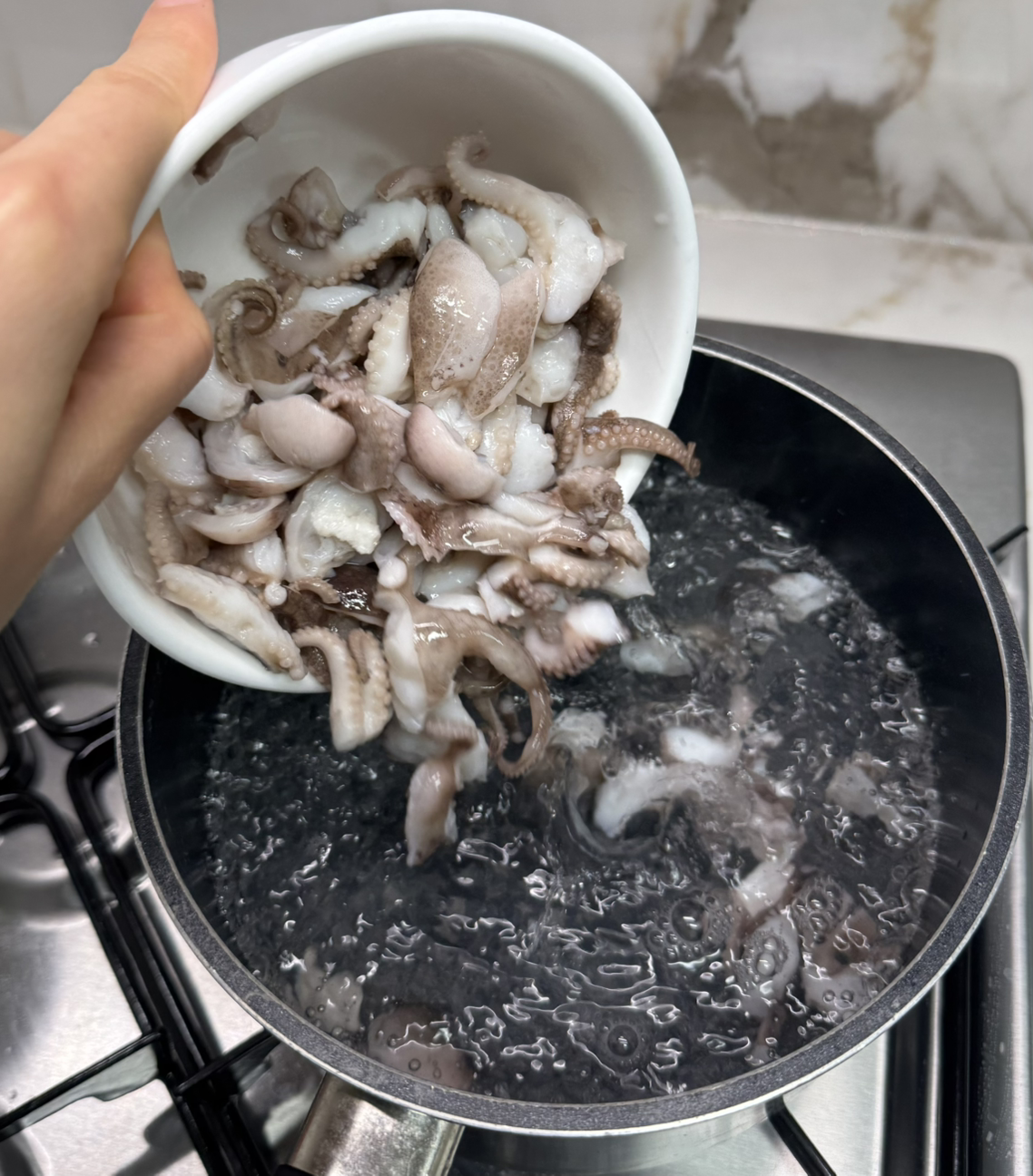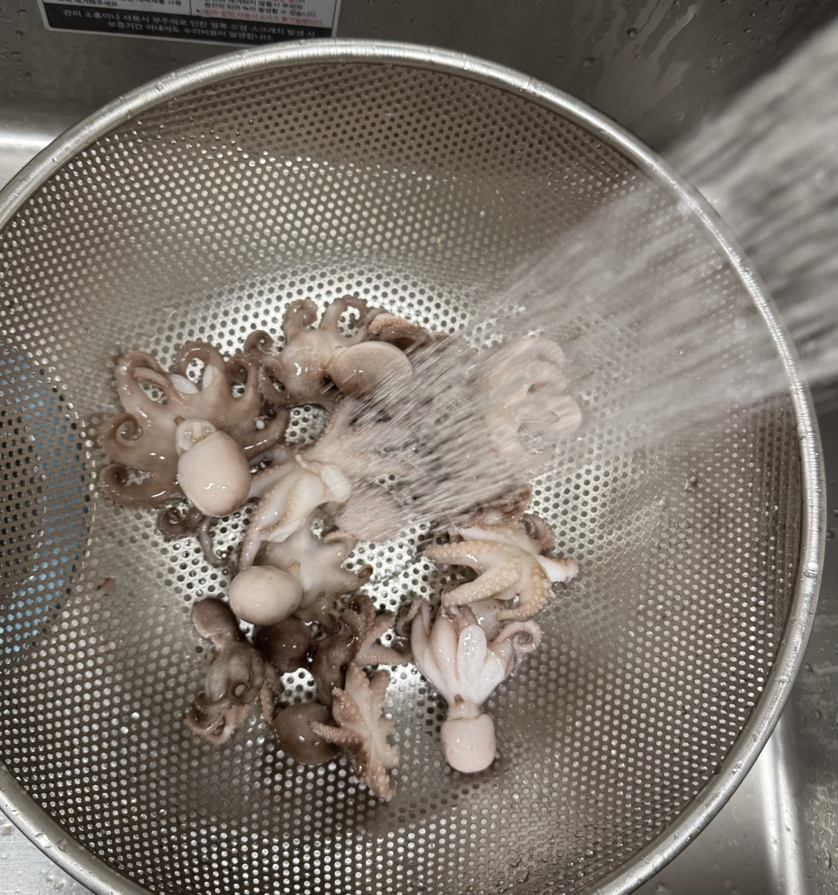 쭈꾸미는 익혀서 맛을 보았는데 질겅한 느낌이 덜 익은 것 같아서 한번 더 충분히 익혀줬다. 냉동된 쭈꾸미를 사용하는 것이기 때문에 충분히 익혀 찬물로 헹궈뒀다. 오징어를 사용해도 괜찮지만, 익혔을 때 오징어보다 연해서 치아가 안 좋으신 분은 쭈꾸미를 사용하는 게 좋다.